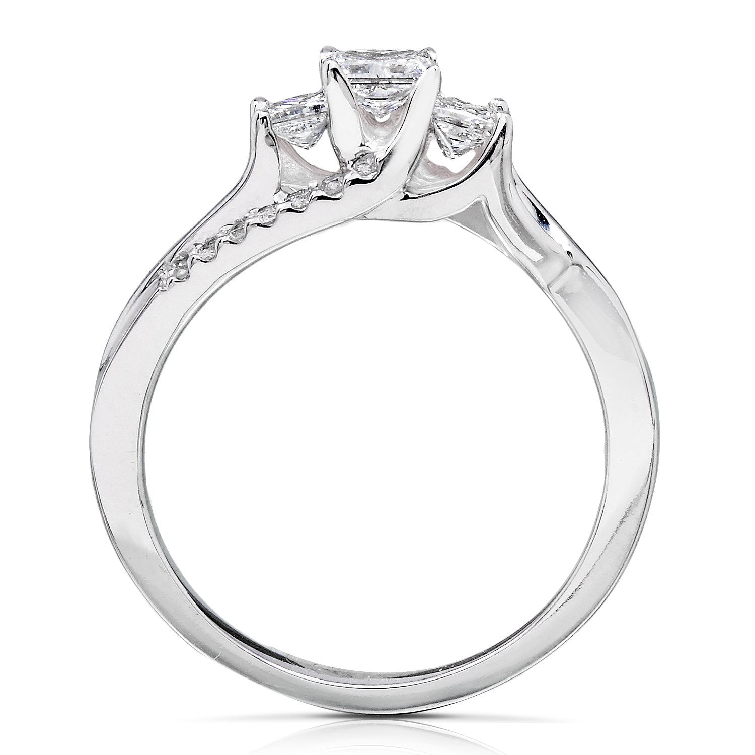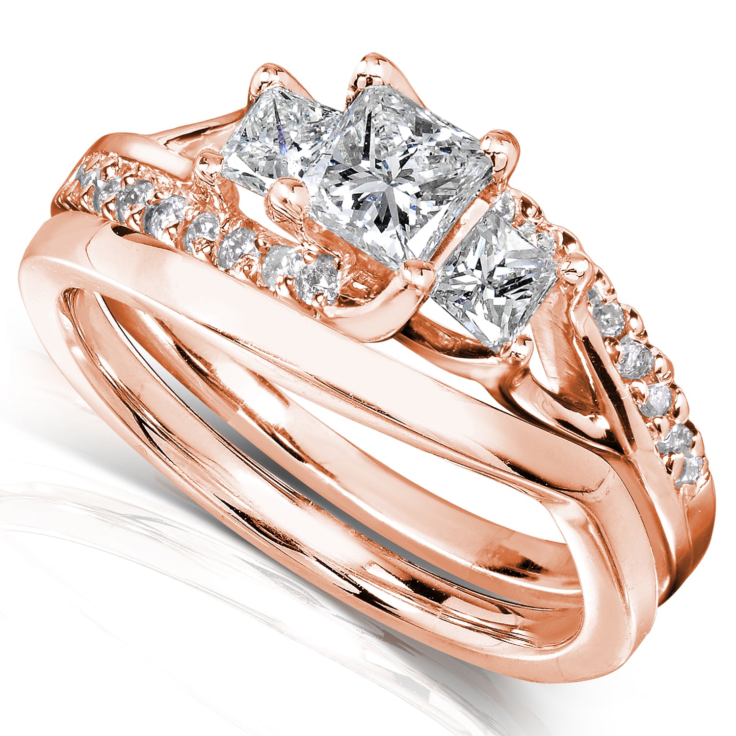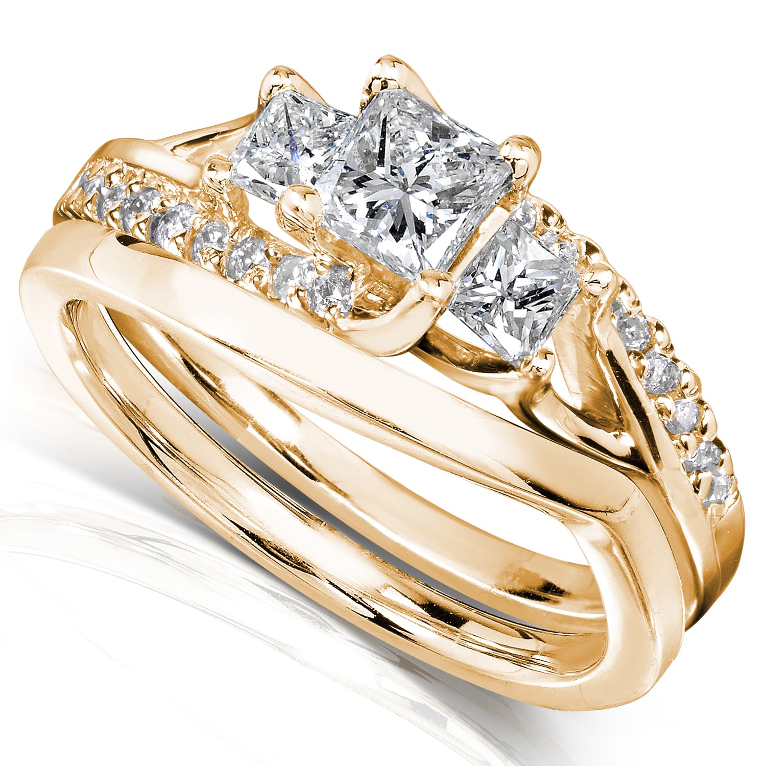 The Kobelli Curved 3-Stone Princess Diamond Bridal Set presents amazing attention to detail on a chic design. The stunning bridal set is a unique take on a classic wedding fashion. Three princess cut diamonds on the engagement ring stand above but not too high over the engagement band giving attention to the princess stones without being in the way as you endure daily activities. The princess-cut diamond is a favorite among diamond lovers because it gives the wearer the best of everything a diamond can offer. Not only does the princess cut look unique and stand out in a crowd, but it also offers stunning brilliance and fire. Set in solid 14-karat gold, the simple solid gold wedding band fits to enhance the engagement ring for a complete wedding set.