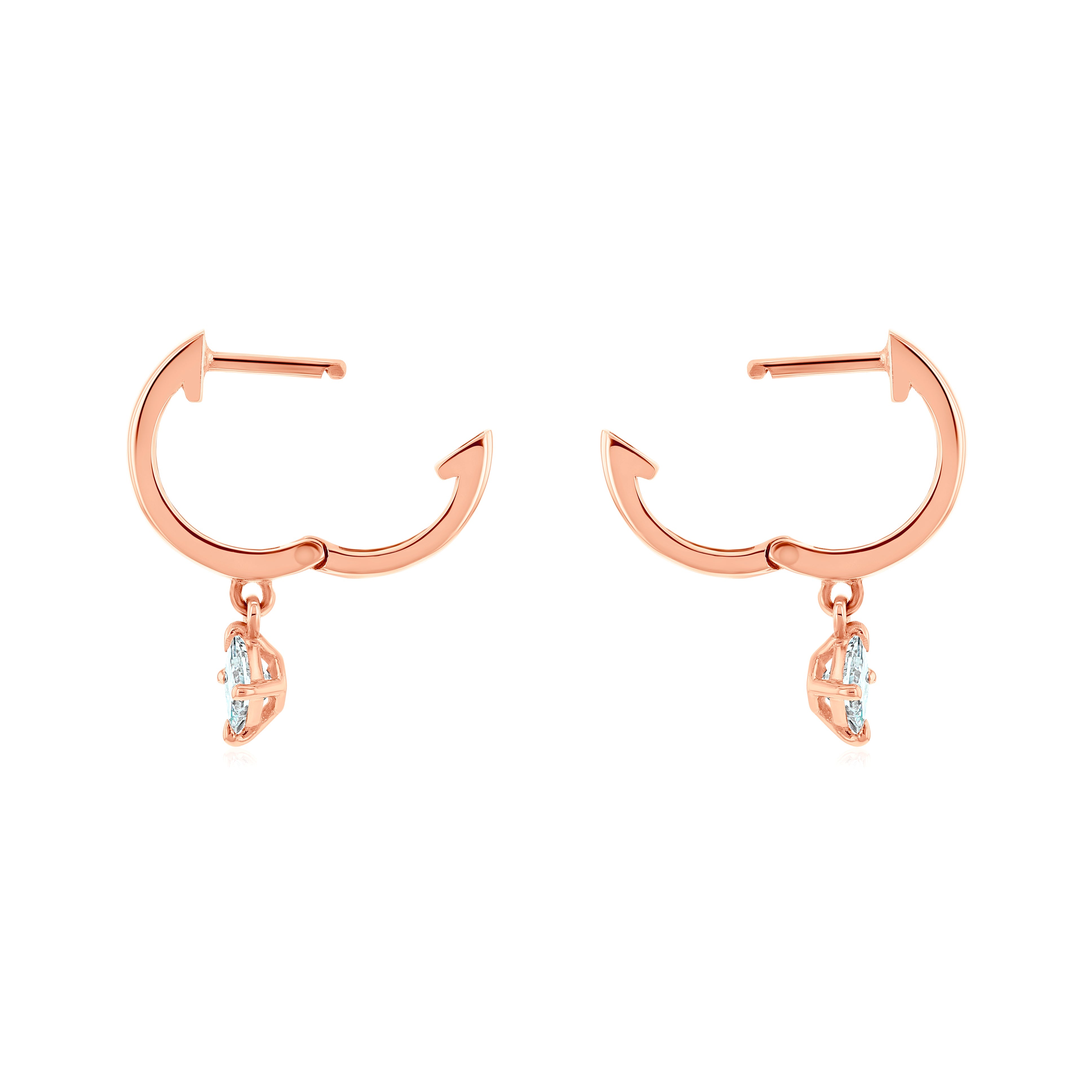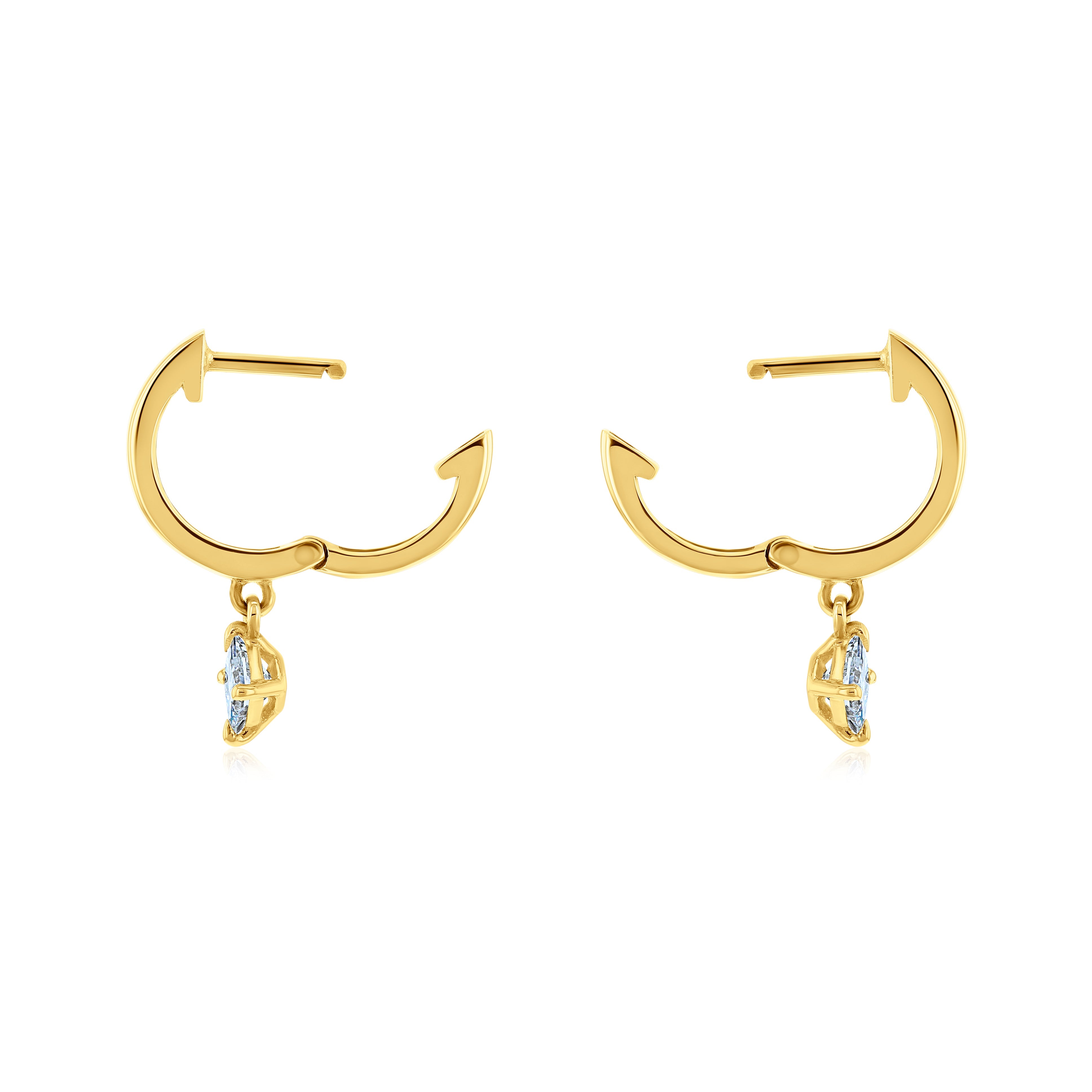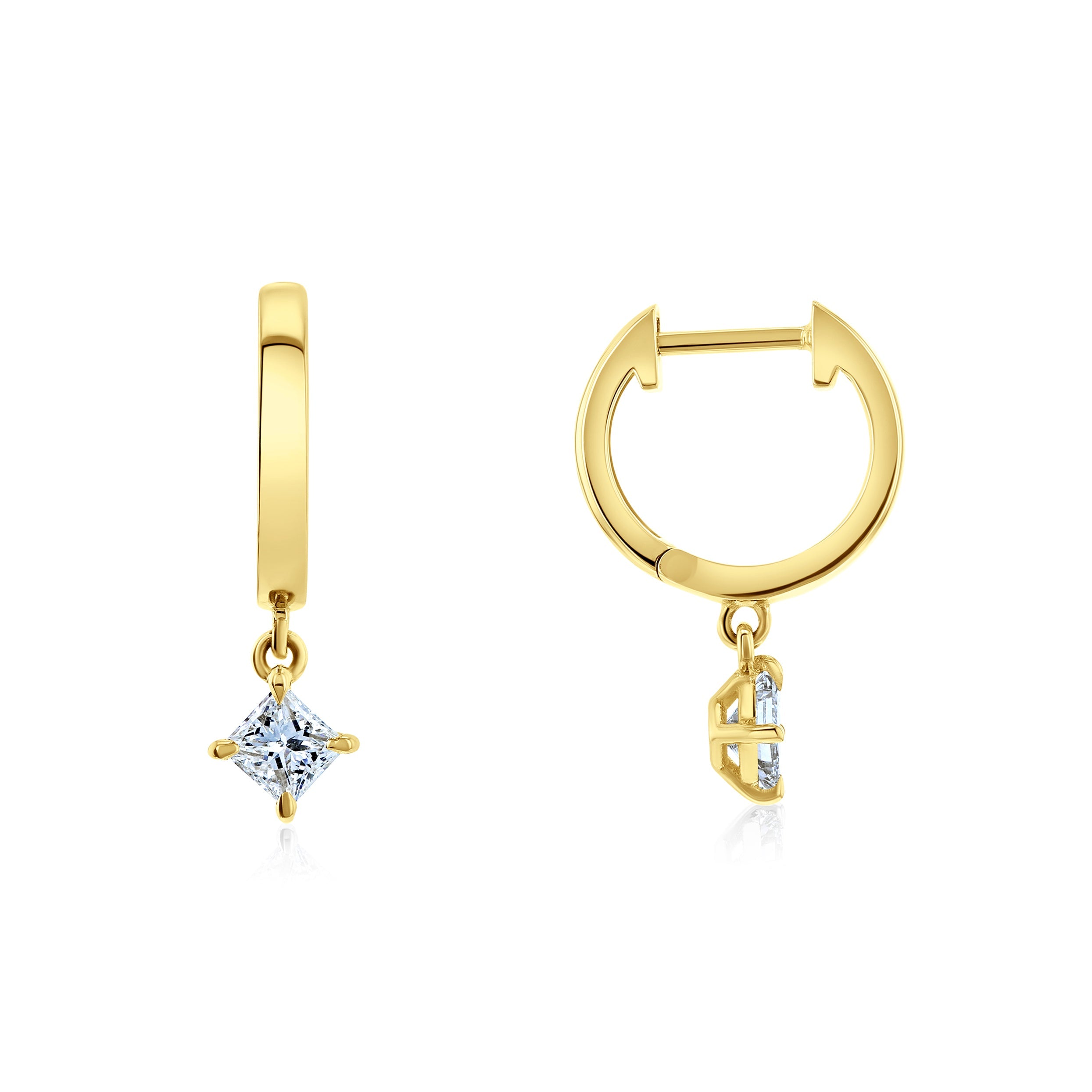 Natural princess-cut diamonds decorate these huggie earrings in minimally chic high fashion. The solitaire princess-cut diamond pendants dangle off the hoops bringing a twinkle of sparkle to the dropping points of each cuff.