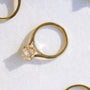 Adding to the design’s classic cathedral look is its bridge optionally illuminated with six diamonds on each side of the engagement ring. Select from a pavé diamond shank or keep it minimally chic with a solid gold style.