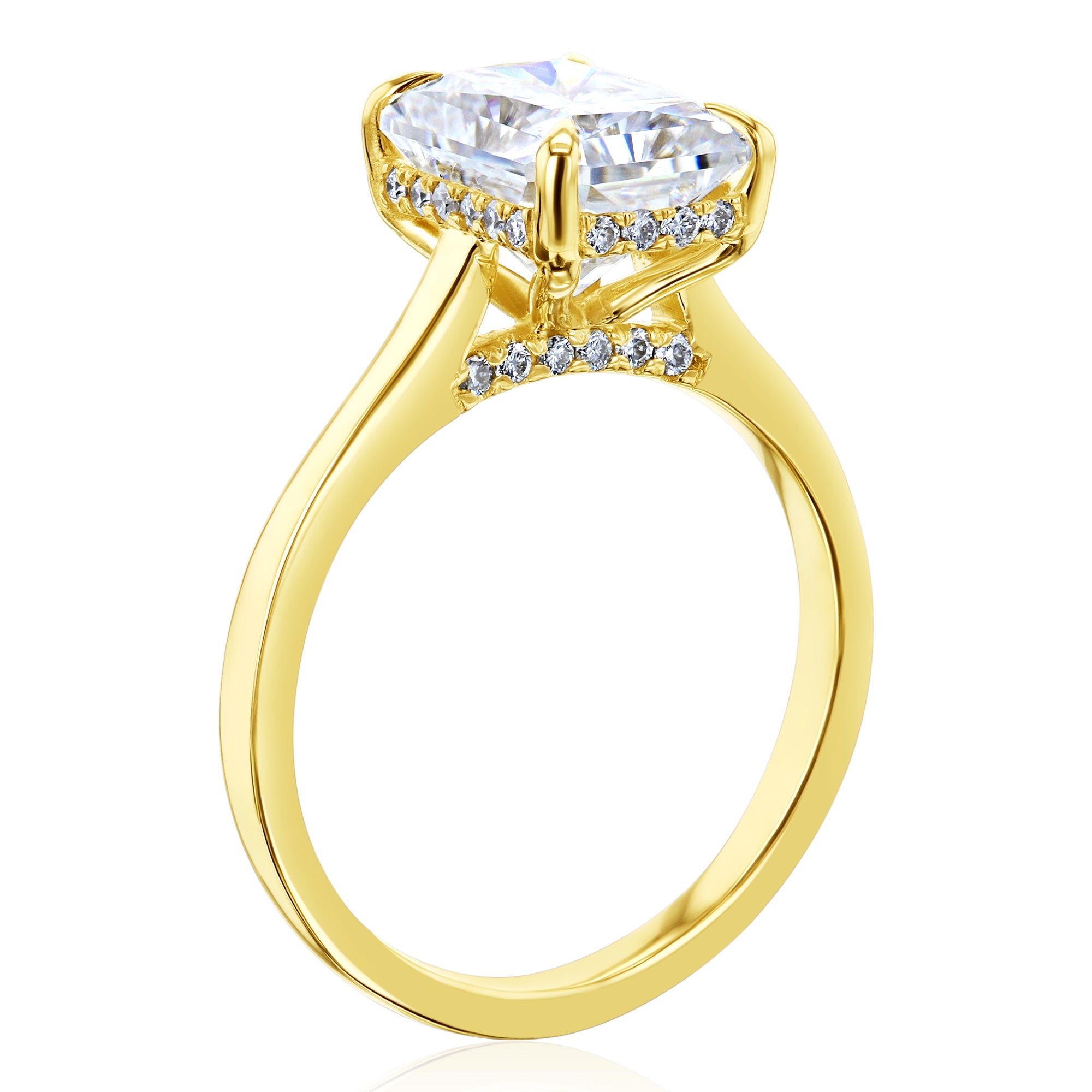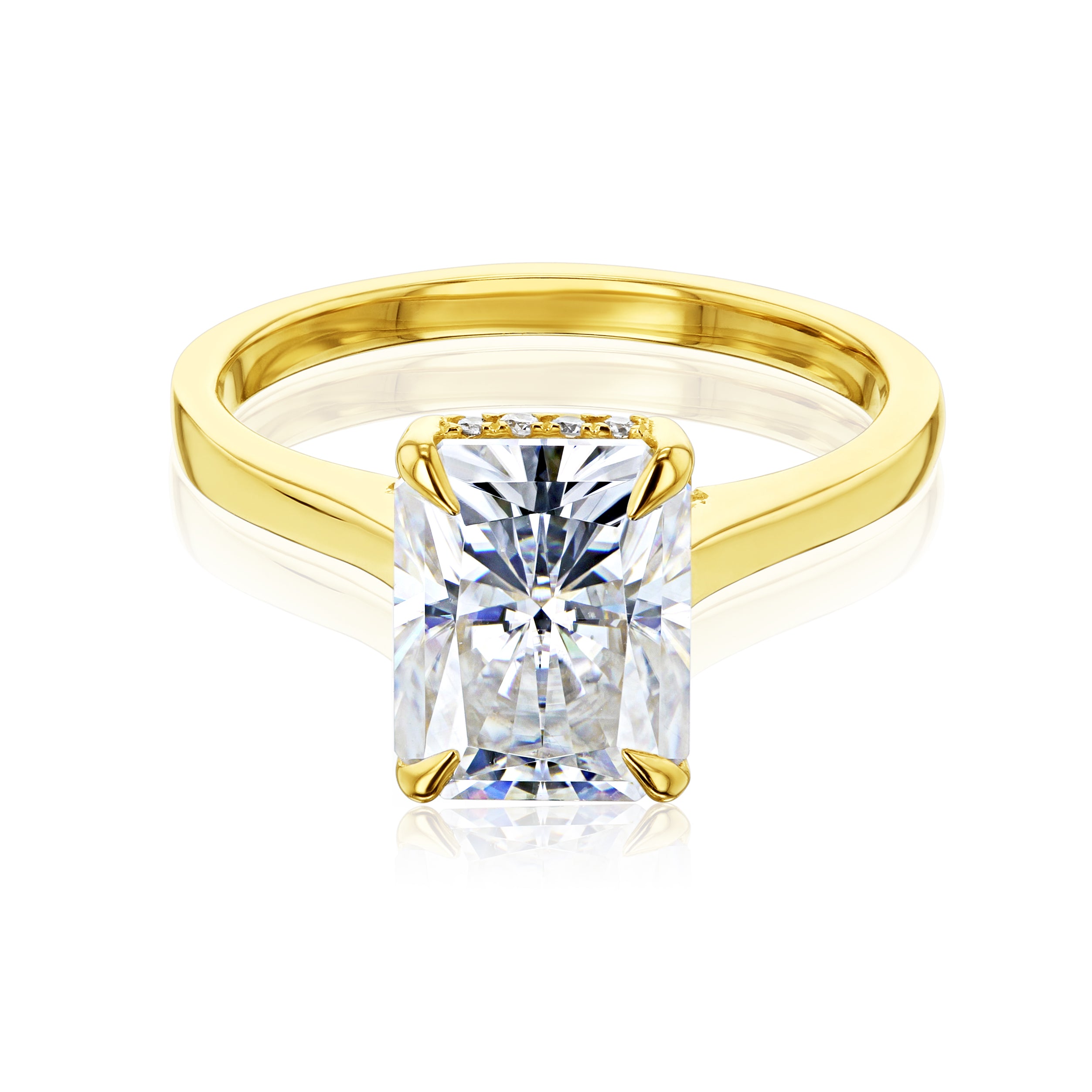 Transform an ordinary wedding proposal into an unforgettable moment in your life with our Rae Radiant Moissanite Cathedral Engagement Ring. Our engagement ring displays a 2.7-carat radiant cut center stone that shows clarity and depth with its clean faceting. The 32 round diamond side stones elevate the head ring as it is raised by a cathedral setting on a 14k solid gold band.