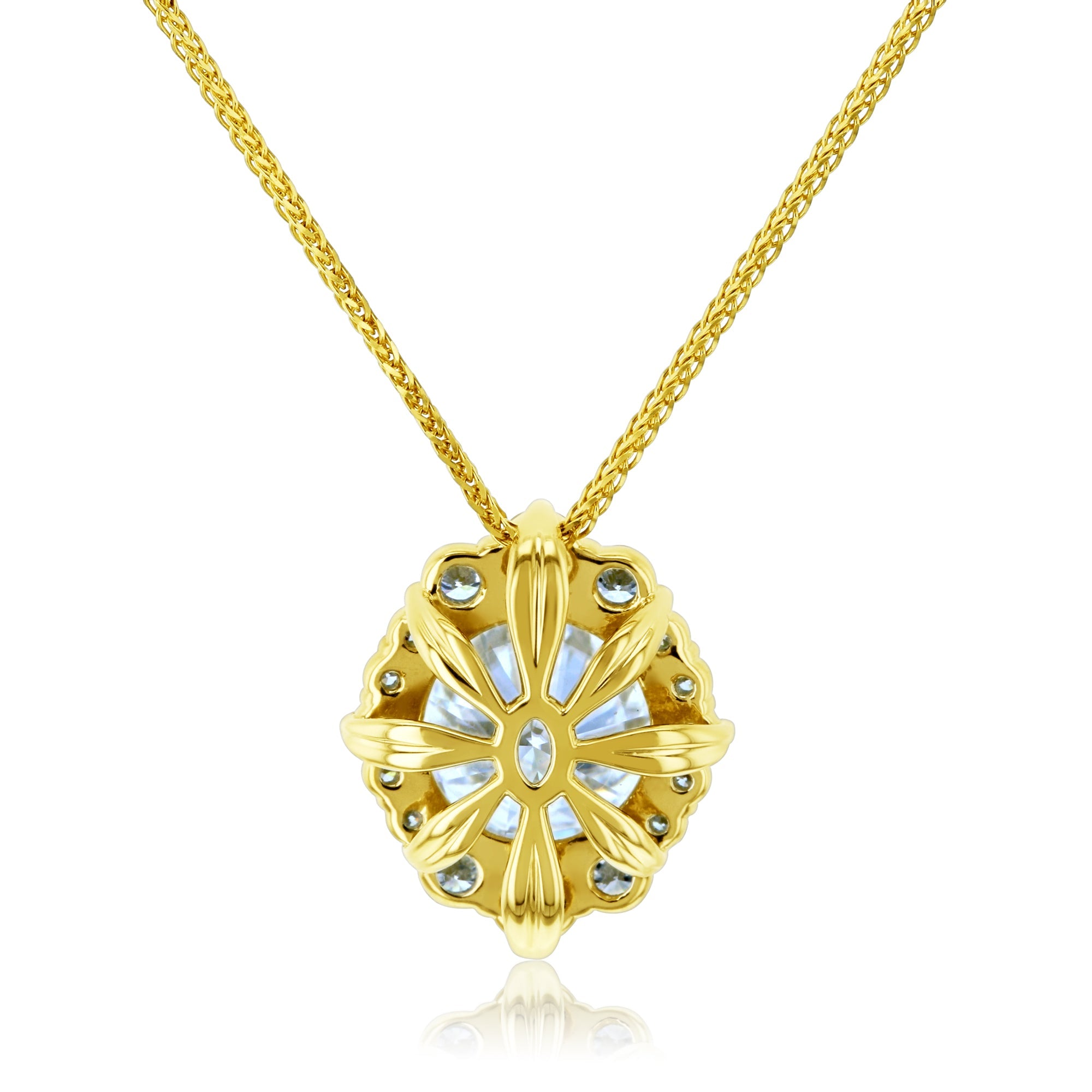 Our Raphaela Necklace comes strung to a fully adjustable gold chain, extending up to 22 inches, making it a versatile accessory matching to any ensemble. A graduating halo comprised of genuine lab-grown white diamonds frames the beautiful 9.5 mm round-cut moissanite center stone. The stones are set in 14-karat gold metal and are finished with a high polish. Caging arches of solid gold streamers bind the backside of the pendant in a simple yet antique fashion flare.