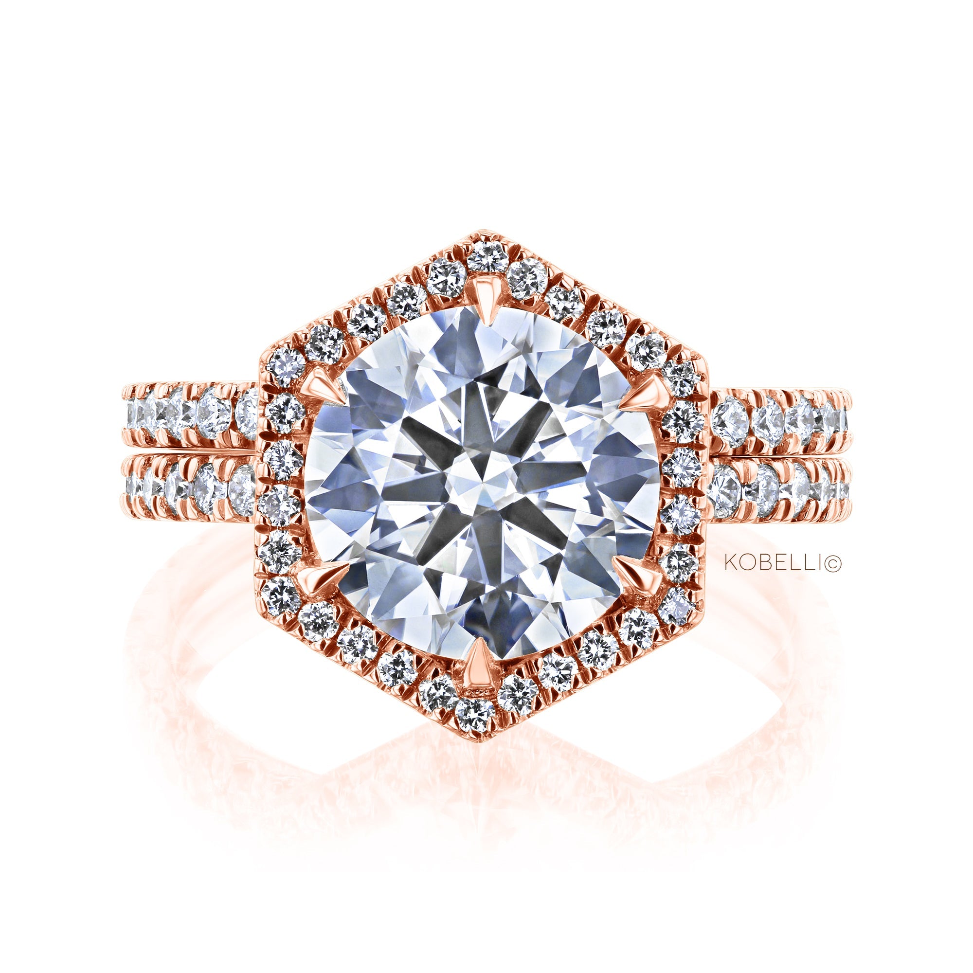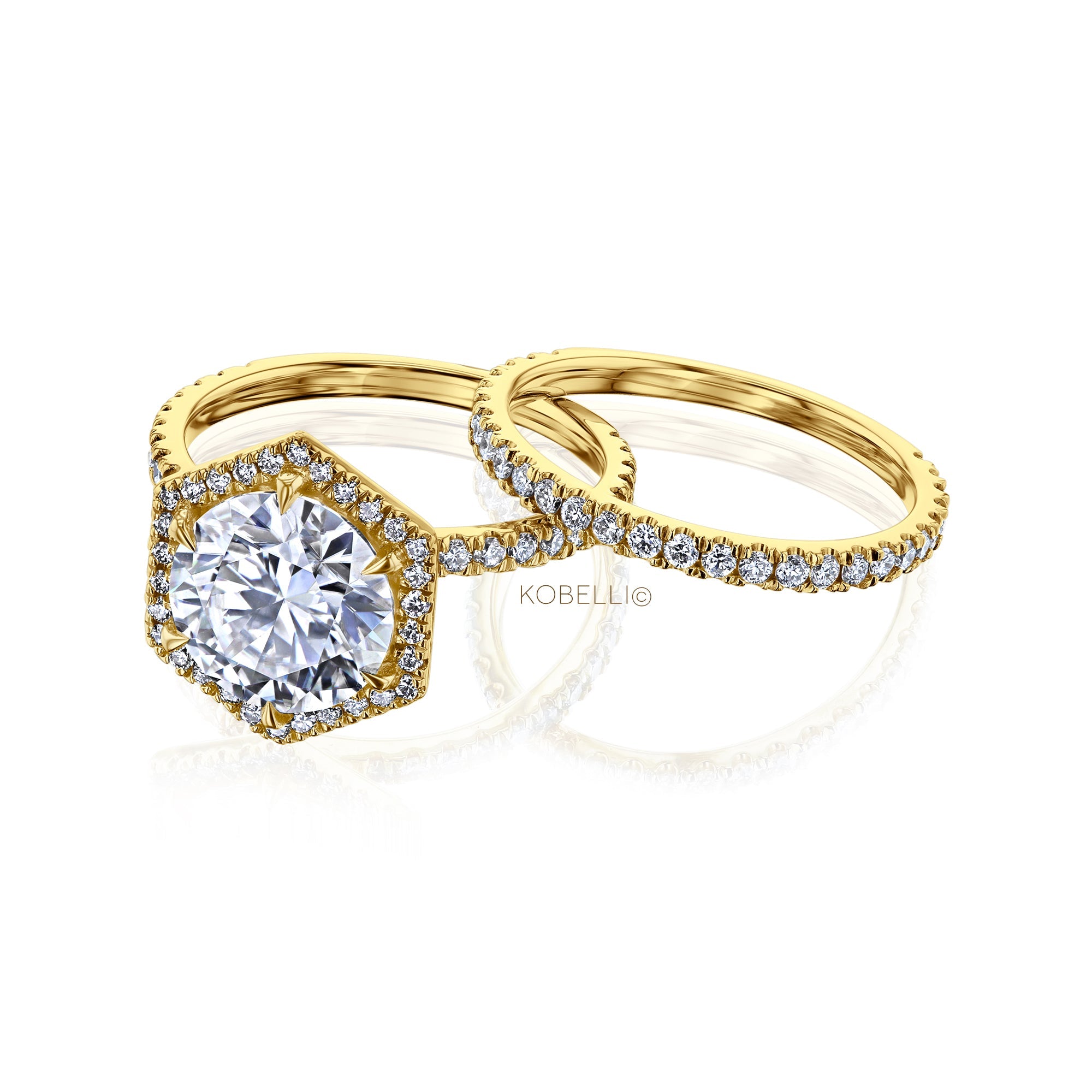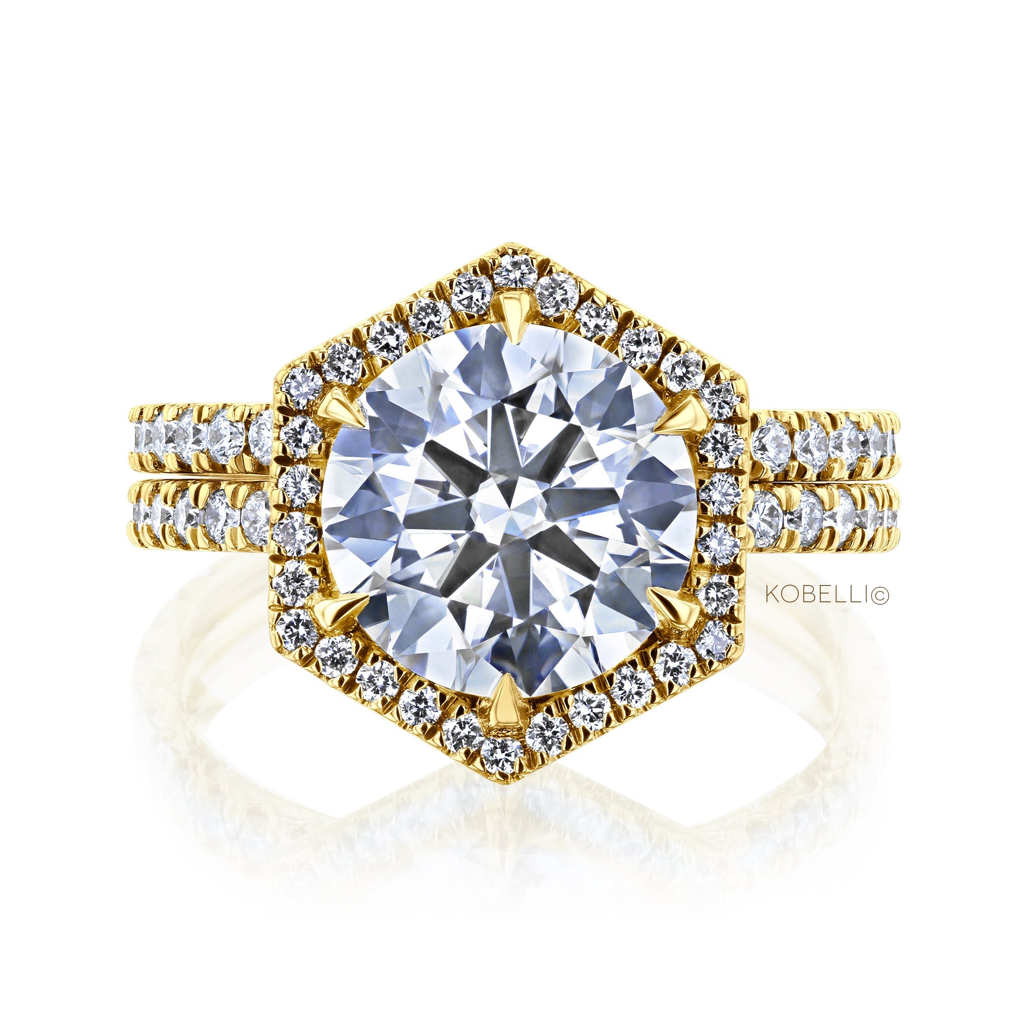 Hexagon Halo 3.1ct Round Moissanite & 0.89ct Diamond Vintage Style Bridal Rings Set - 4ct.tw in 14k Gold