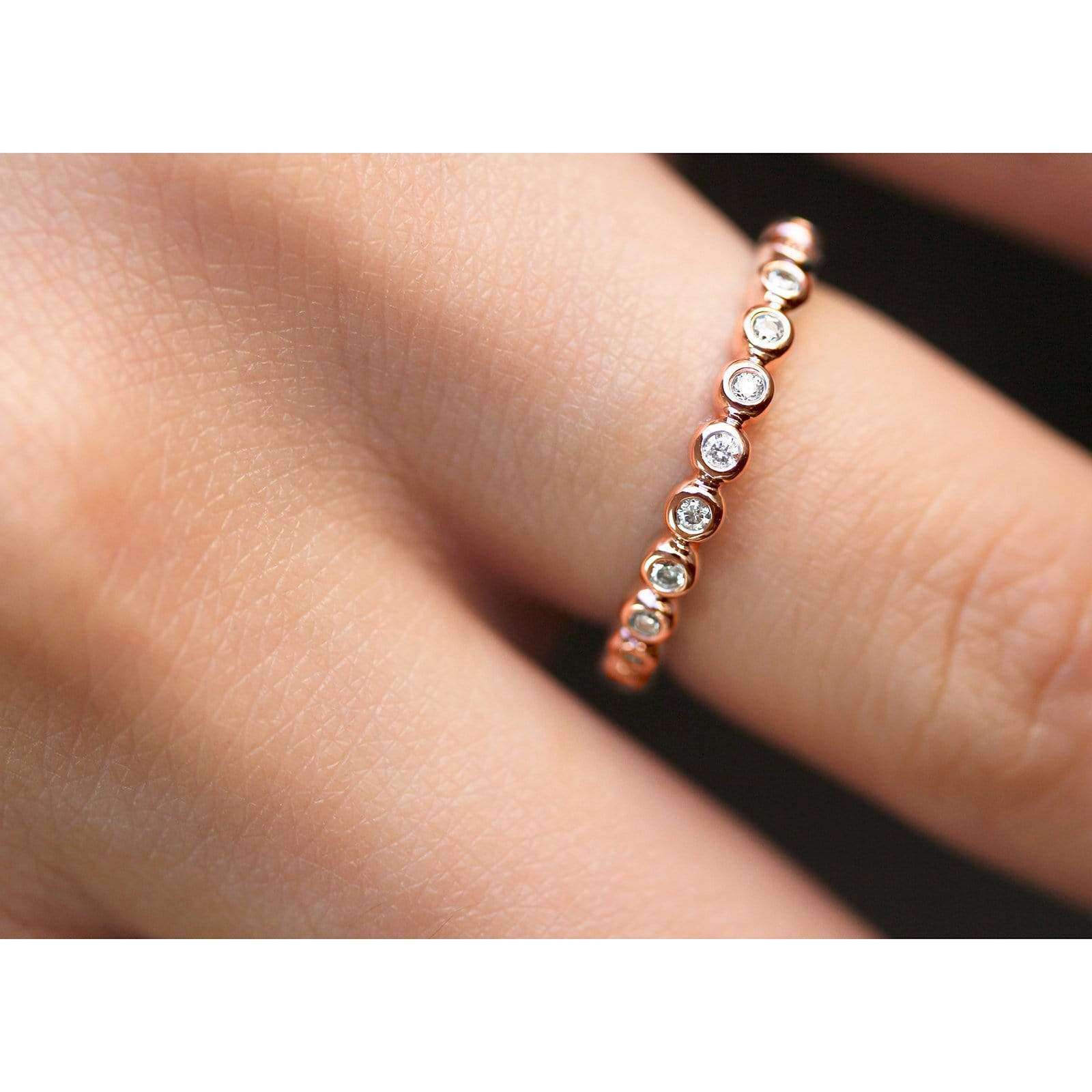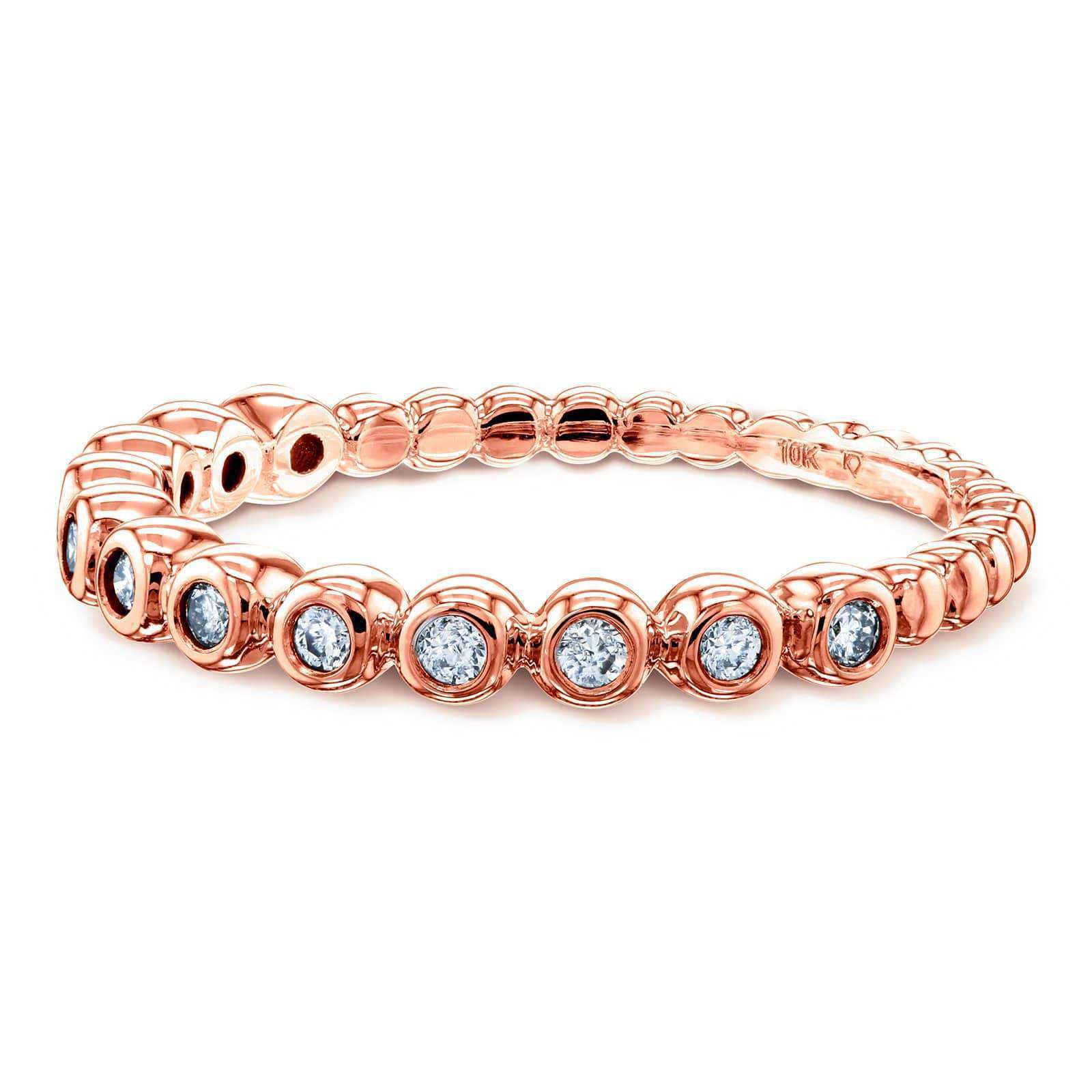 Twelve round bezel-set diamonds flourish across a ravine of solid rose gold on this fashionable fine jewelry women's band. The high quality materials and craftsmanship makes this the perfect diamond wedding band whereas the stylish and eye catching design makes it a trendy accessory. However you choose to wear this ring, whether with an engagement ring, stacked to another fashionable wonder, or solo as a minimalist wardrobe accent, you will be glad to have this twinkling upon your finger. The beaded texture provides a comfortable grip and makes for a delightful pattern to run your fingers across in times of boredom. This ring is refinement with playfulness and stylish in modesty all in one place. Every stone is a real earth mined diamond and is conflict free by acquisition. The solid gold is 10-karats in purity and is finished with a high polish. The width of the ring along the bezels is 2.5 mm wide.