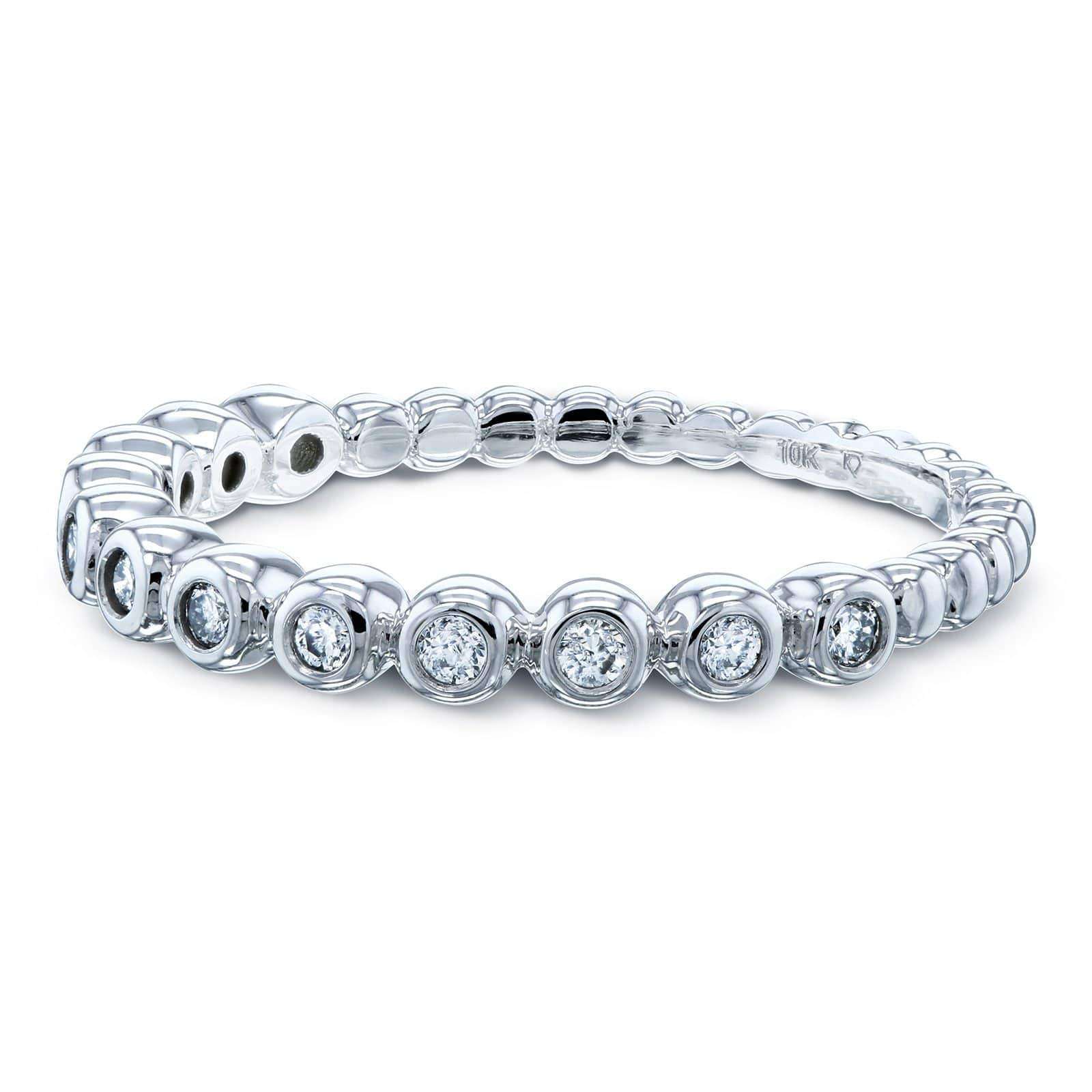 Twelve round bezel-set diamonds flourish across a ravine of solid white gold on this fashionable fine jewelry women's band. The high quality materials and craftsmanship makes this the perfect diamond wedding band whereas the stylish and eye catching design makes it a trendy accessory. However you choose to wear this ring, whether with an engagement ring, stacked to another fashionable wonder, or solo as a minimalist wardrobe accent, you will be glad to have this twinkling upon your finger. The beaded texture provides a comfortable grip and makes for a delightful pattern to run your fingers across in times of boredom. This ring is refinement with playfulness and stylish in modesty all in one place. Every stone is a real earth mined diamond and is conflict free by acquisition. The solid gold is 10-karats in purity and is finished with a high polish. The width of the ring along the bezels is 2.5 mm wide.