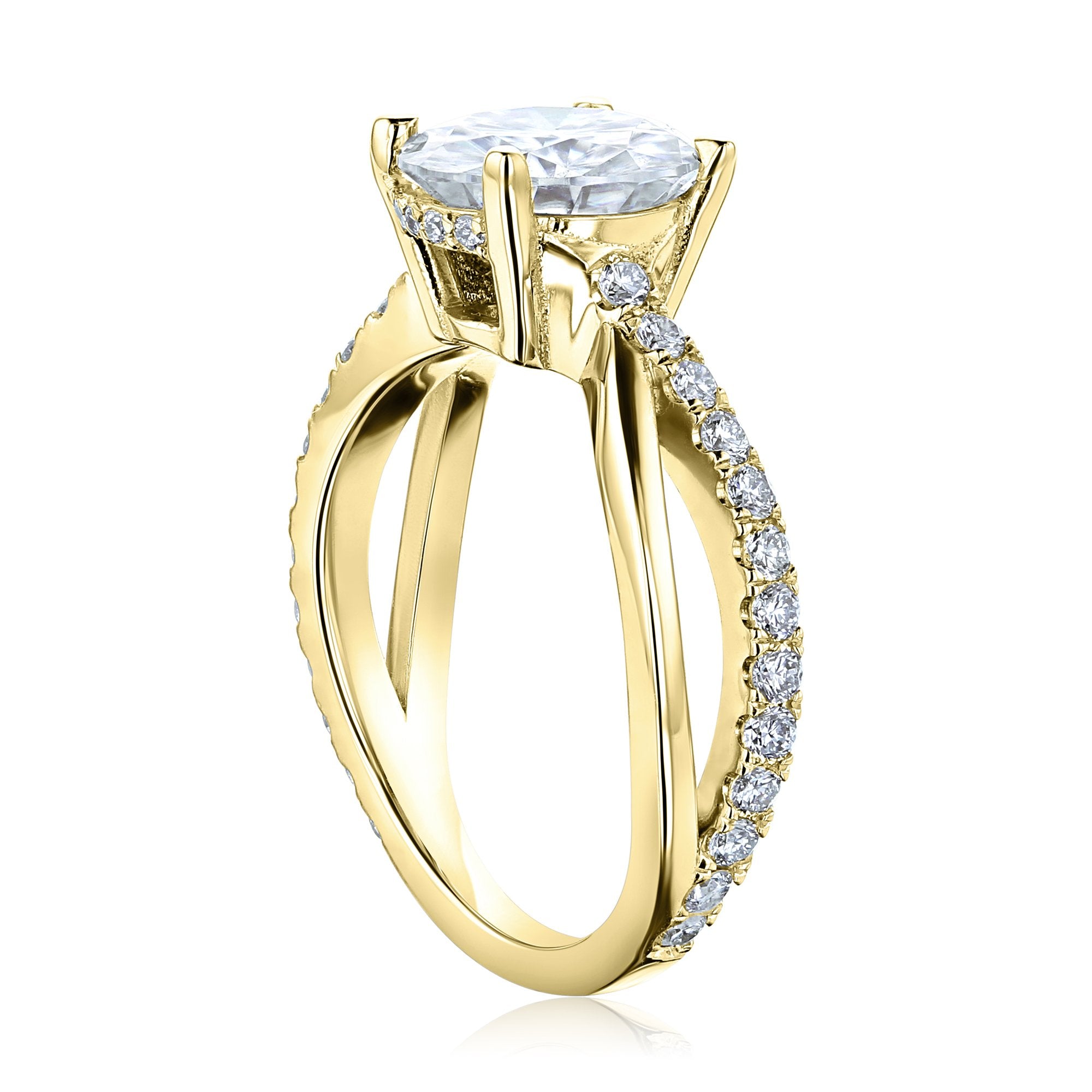 A diamond-accented ribbon bypass design is the focal point of this engagement ring. Round lab-grown diamonds adorn the shank and basket of the center for a brilliance complementing the ring's high-polished finish in solid 14k gold.