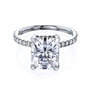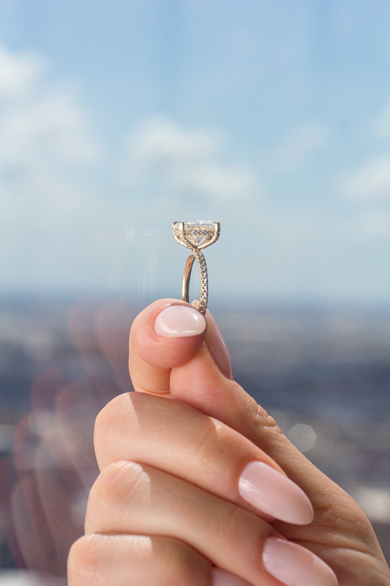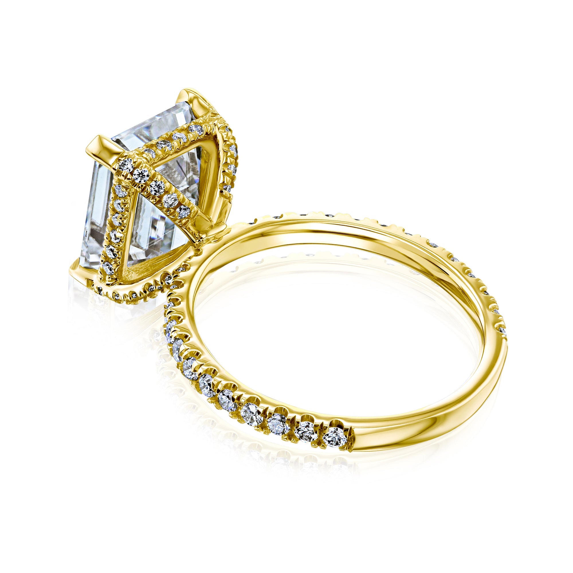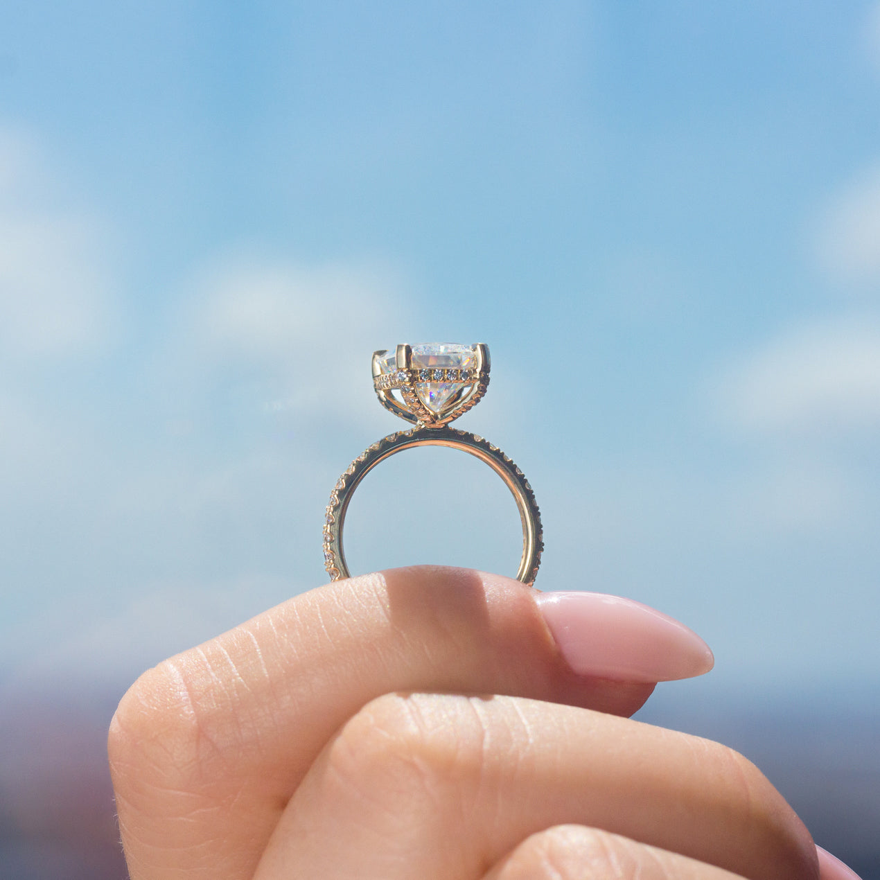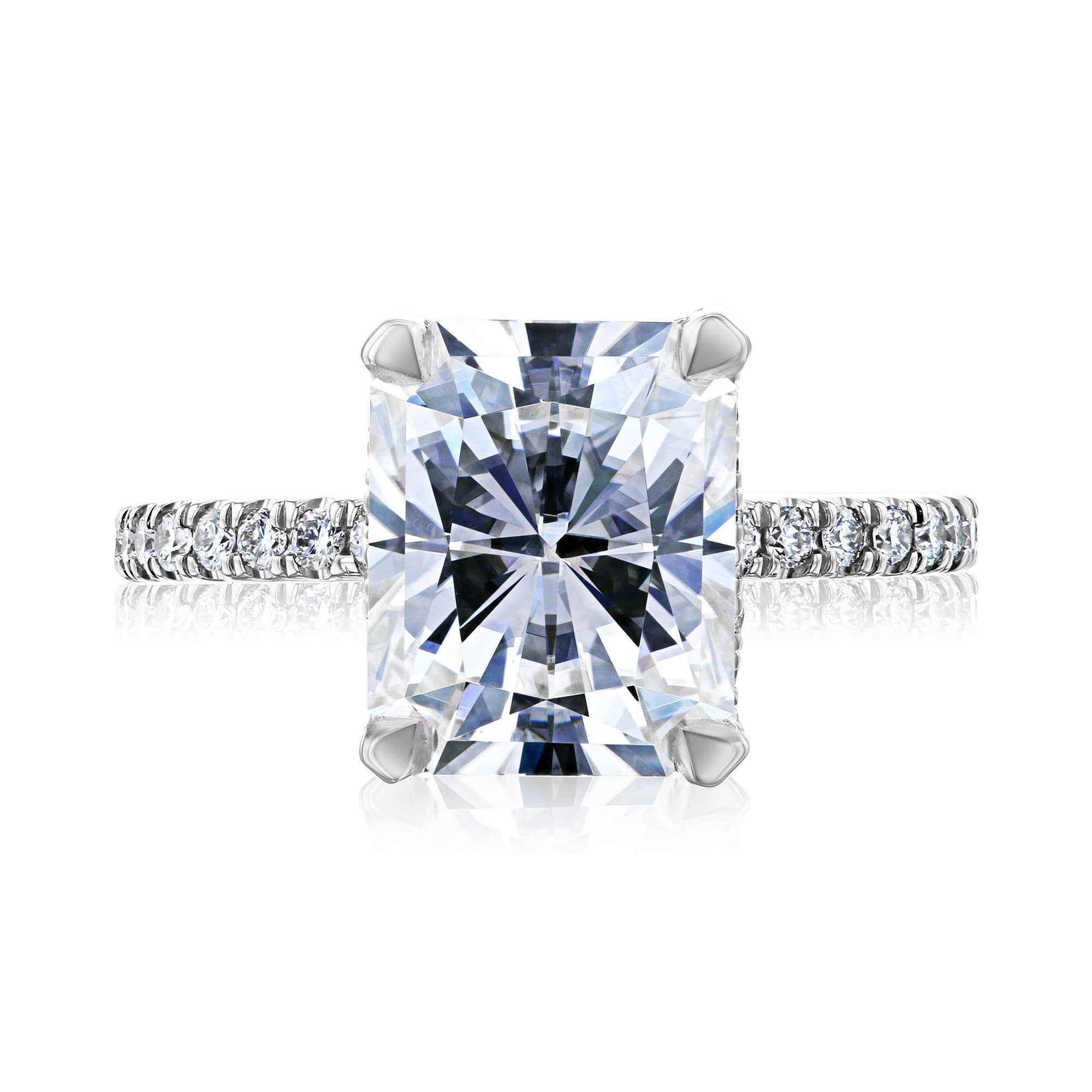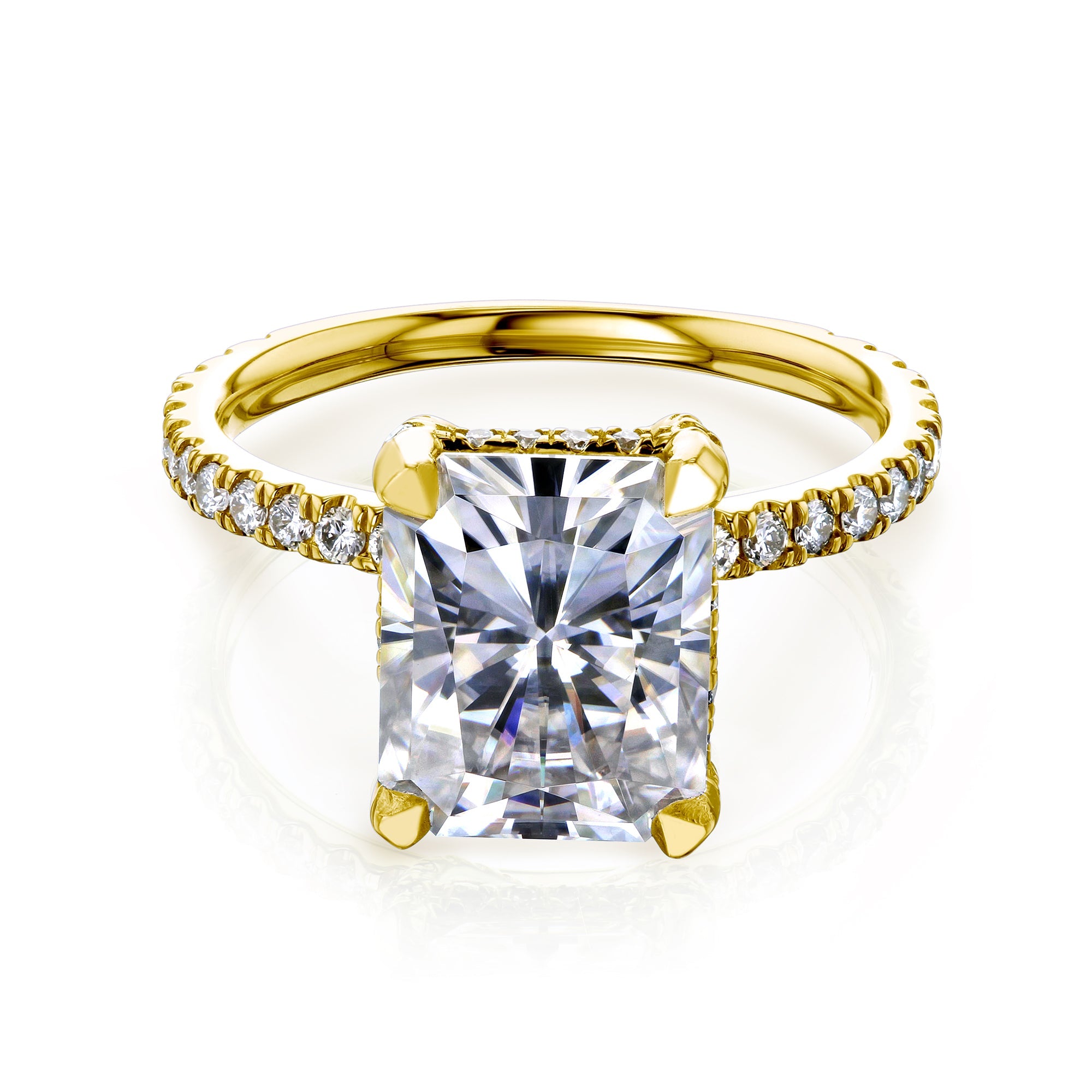 The Riri 10x8 engagement ring features a 10x8 mm (3.9 carats diamond equivalent weight) radiant moissanite center stone with a hidden halo of lab-grown diamonds in a slim basket setting. The basket and shank are illuminated with pavé lab-grown diamonds in a semi-eternity fashion.