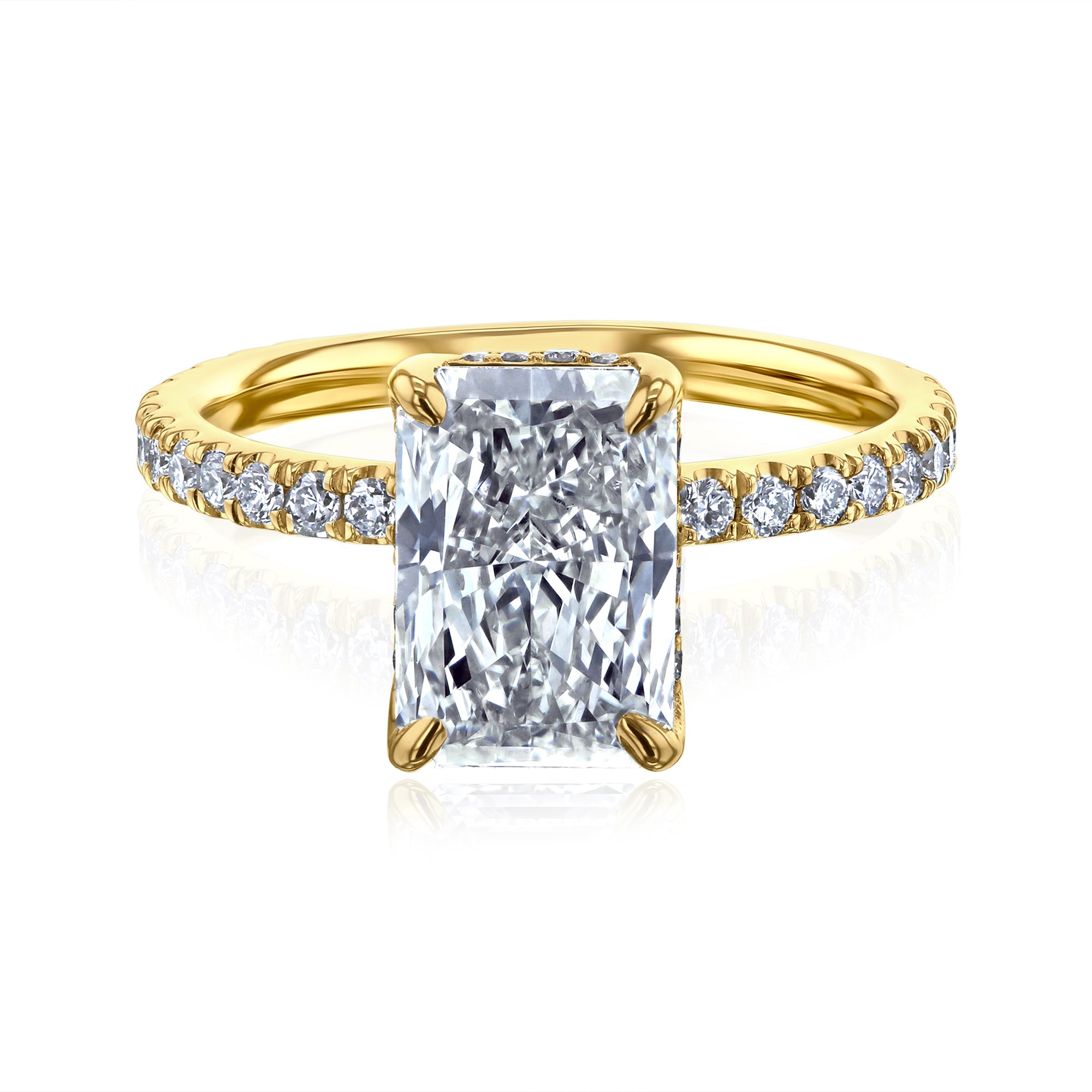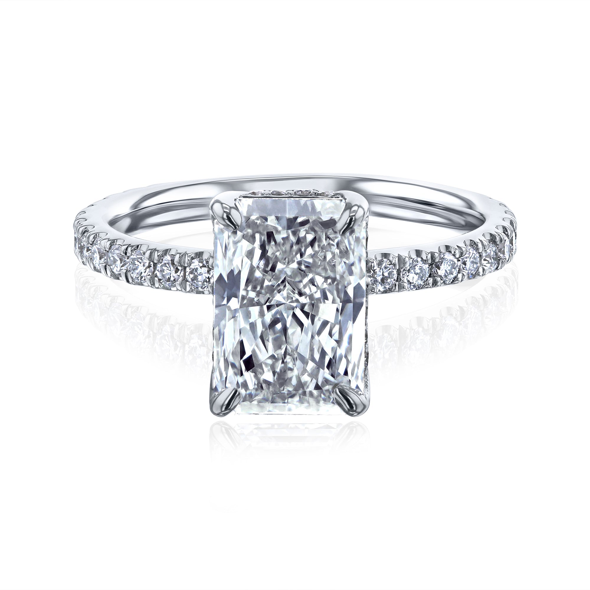 Merging the overall structure of Riri from the Hidden Halo Series of our Signature Collection along with styled prongs from our Blossom Collection, this all-diamond engagement ring features a floating hidden halo top over a diamond lined band.