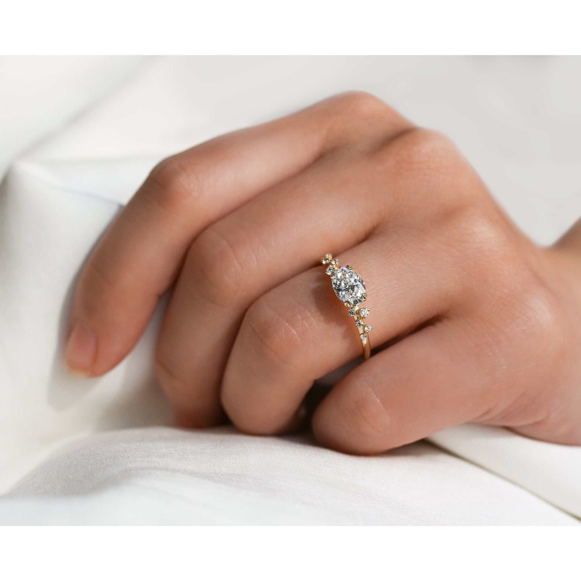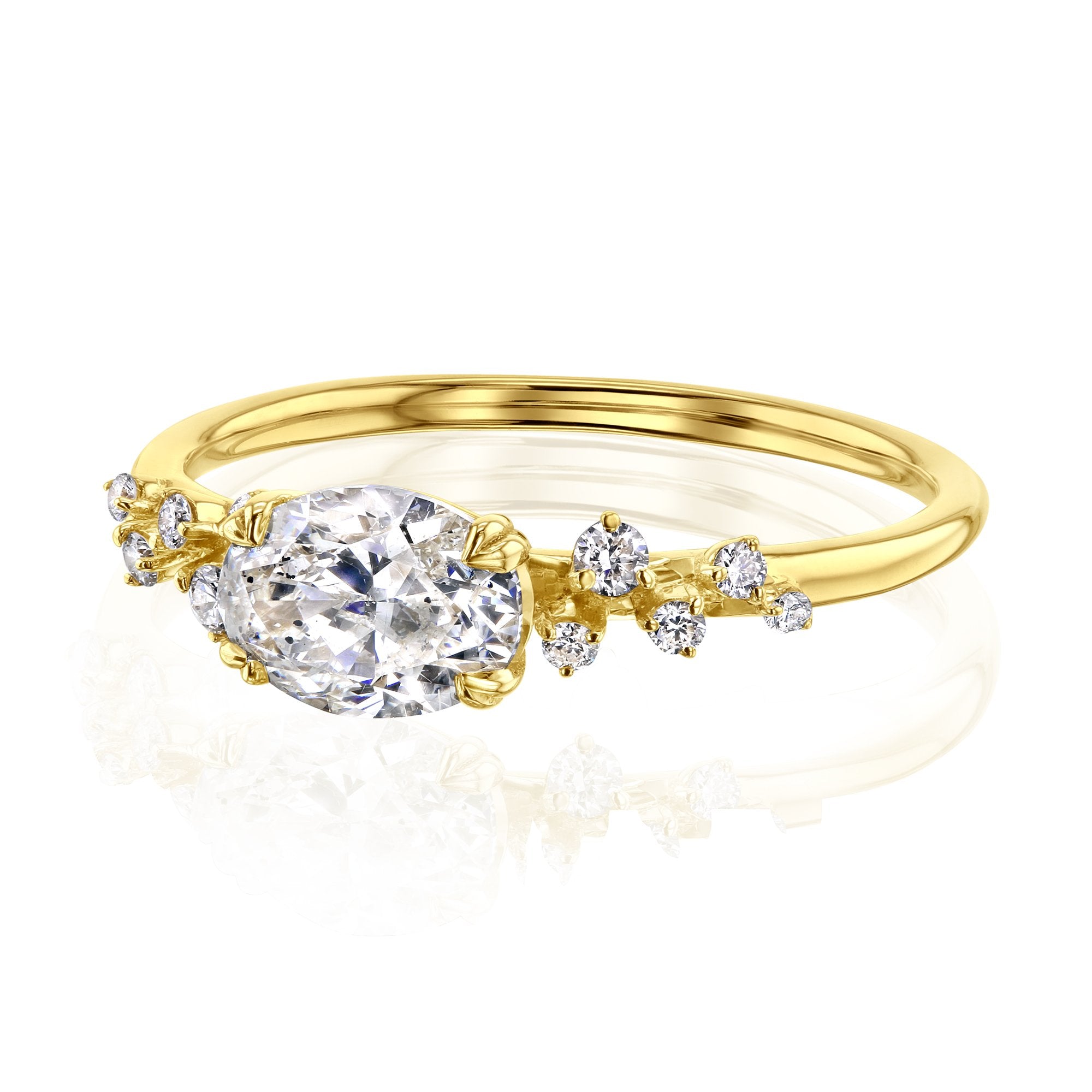 A romantic flair is evoked from this dainty 14-karat yellow gold ring. As simple as its design may be, the details in this lovely piece does not go amiss. The prongs on the 1 carat oval diamond in east-west style are crafted in such a way to resemble a double-prong look on the side on each corner of the basket. The clean and minimal lines complement the cluster of dainty round natural diamonds on both sides of the center stone. It's a one-of-a-kind ring that is sure to set hearts aflutter.