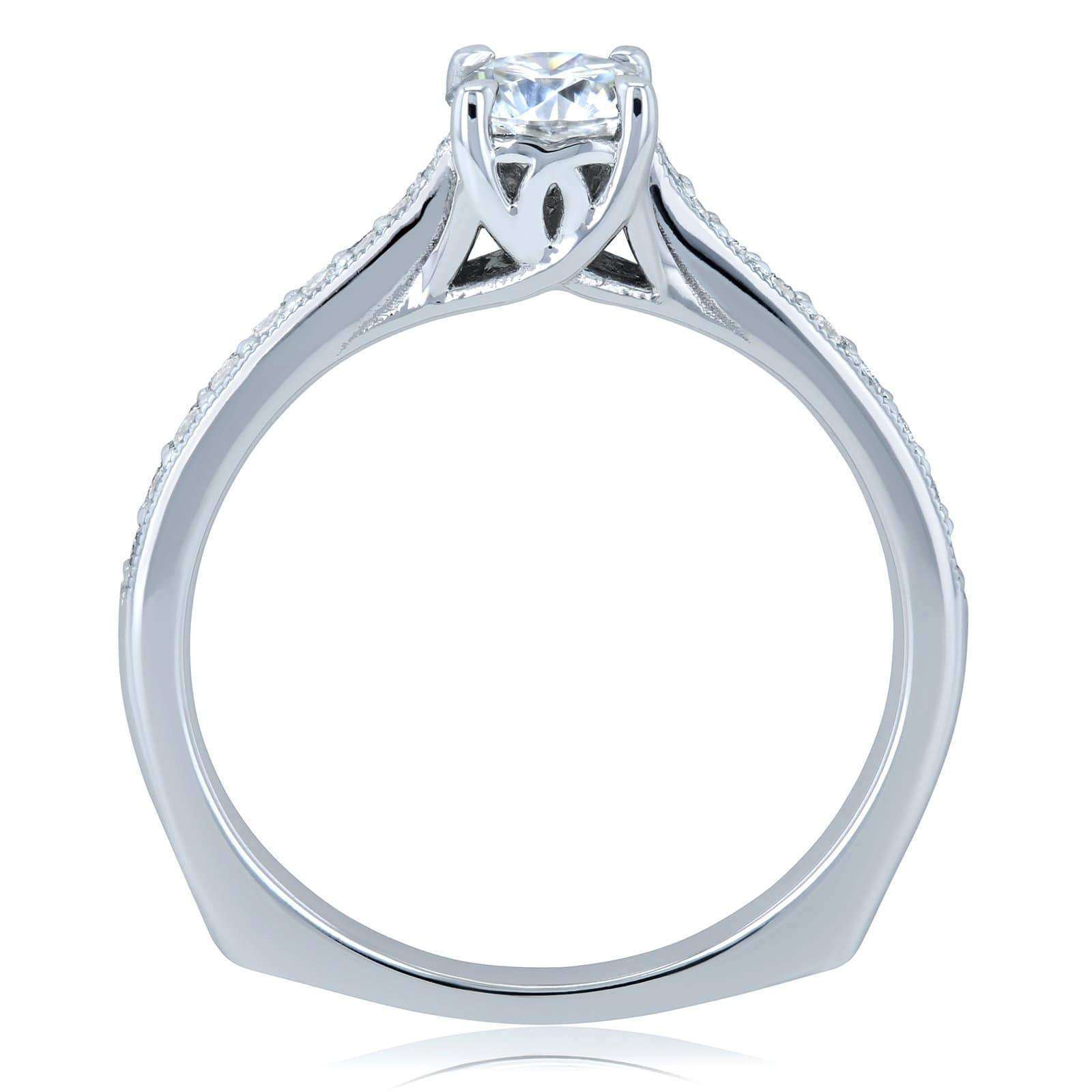 A round-cut 5mm moissanite is held with an x-prong trellis setting over fourteen-karat gold and pave-set side diamonds. The diamonds are all genuine stones harvested from the earth from conflict-free sources. The center moissanite gemstone is a lab-created perfected stone made to sparkle greater than a diamond with its famed fire power. The band is decorated with vintage style milgrain edges which immediately enhances the dazzling diamonds with a dynamic of patterned ruffles and a captivating appearance fit for royalty. The smart design of this engagement ring features a square shank known as a European shank to help keep the ring from spinning off center as you wear it.