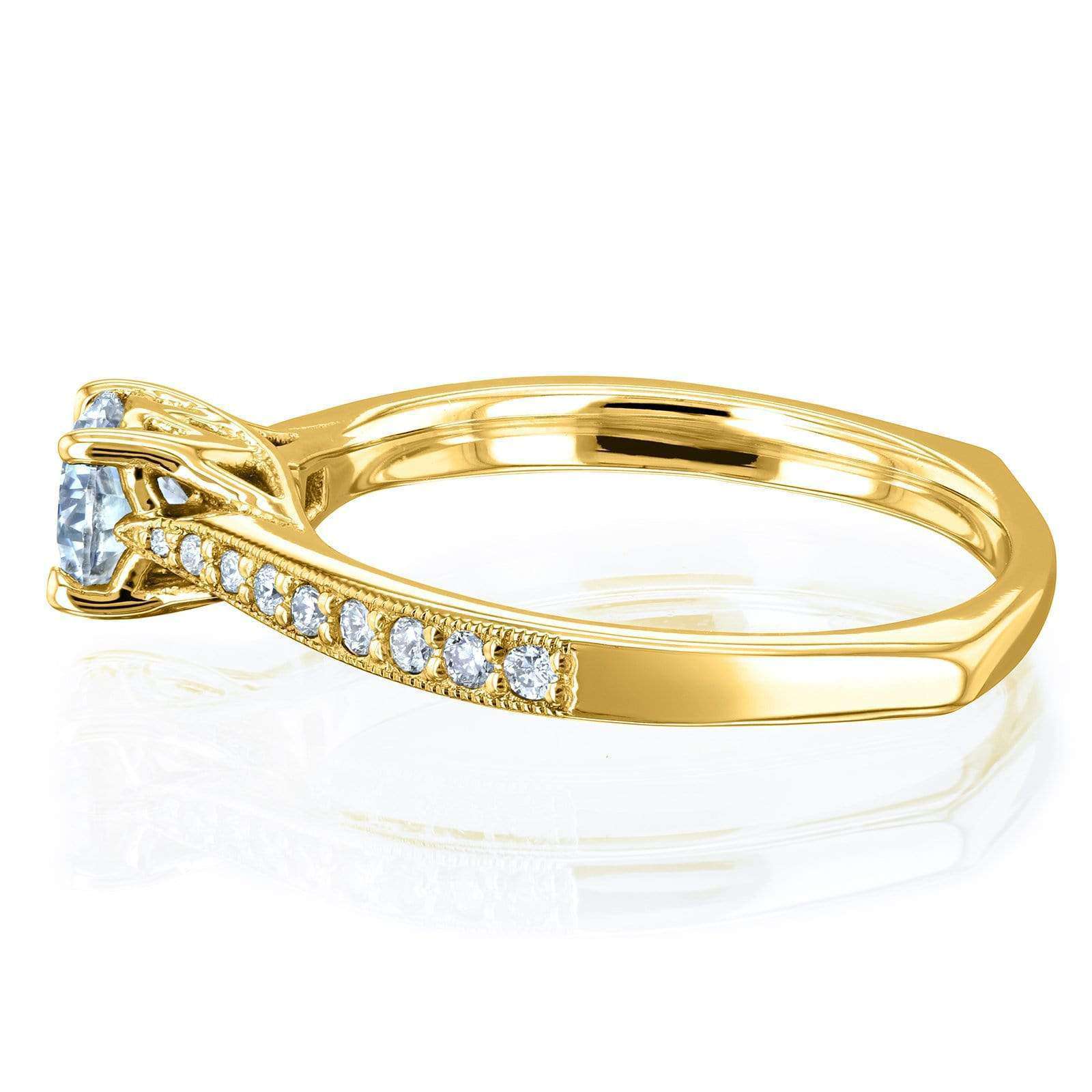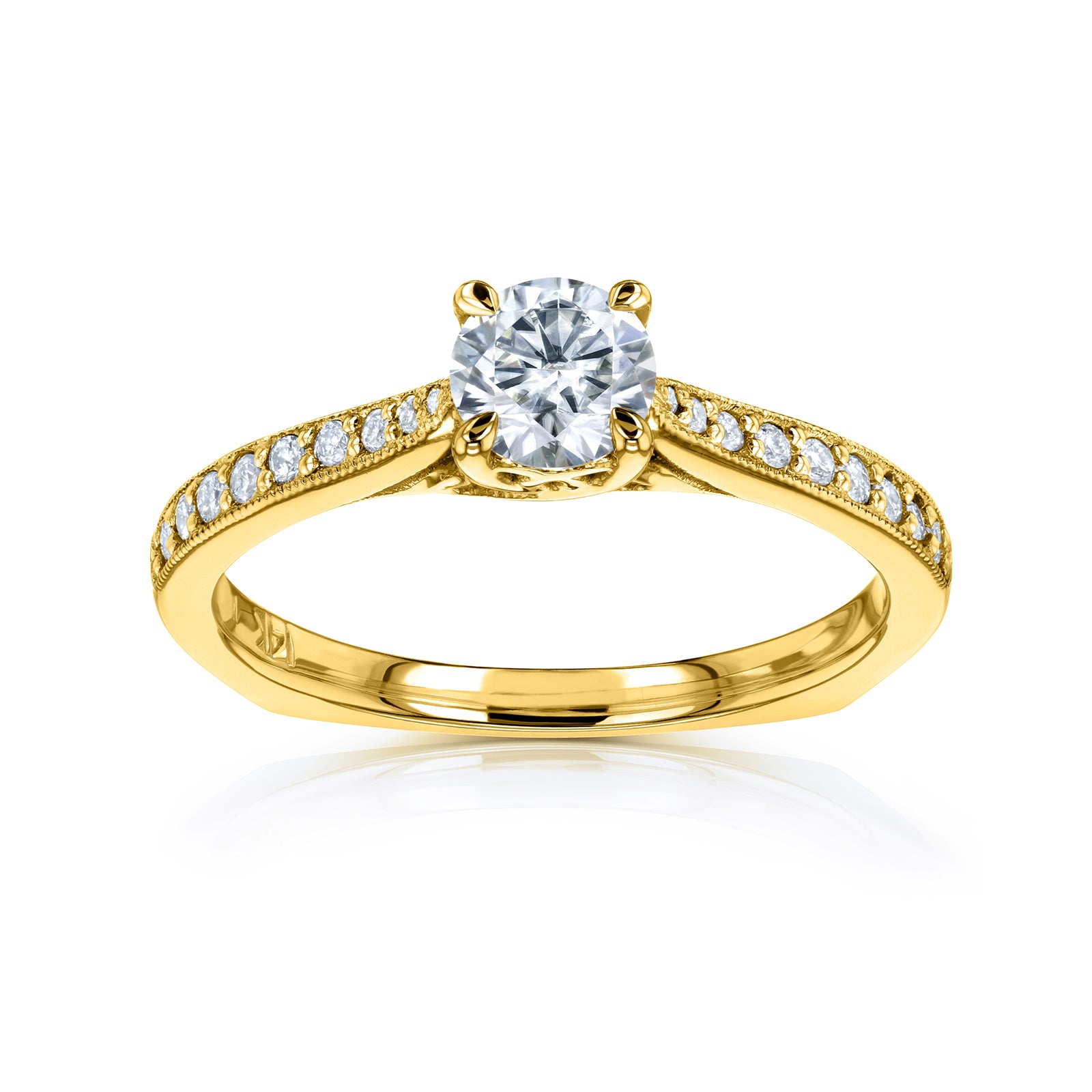 A round-cut 5mm moissanite is held with an x-prong trellis setting over fourteen-karat gold and pave-set side diamonds. The diamonds are all genuine stones harvested from the earth from conflict-free sources. The center moissanite gemstone is a lab-created perfected stone made to sparkle greater than a diamond with its famed fire power. The band is decorated with vintage style milgrain edges which immediately enhances the dazzling diamonds with a dynamic of patterned ruffles and a captivating appearance fit for royalty. The smart design of this engagement ring features a square shank known as a European shank to help keep the ring from spinning off center as you wear it.