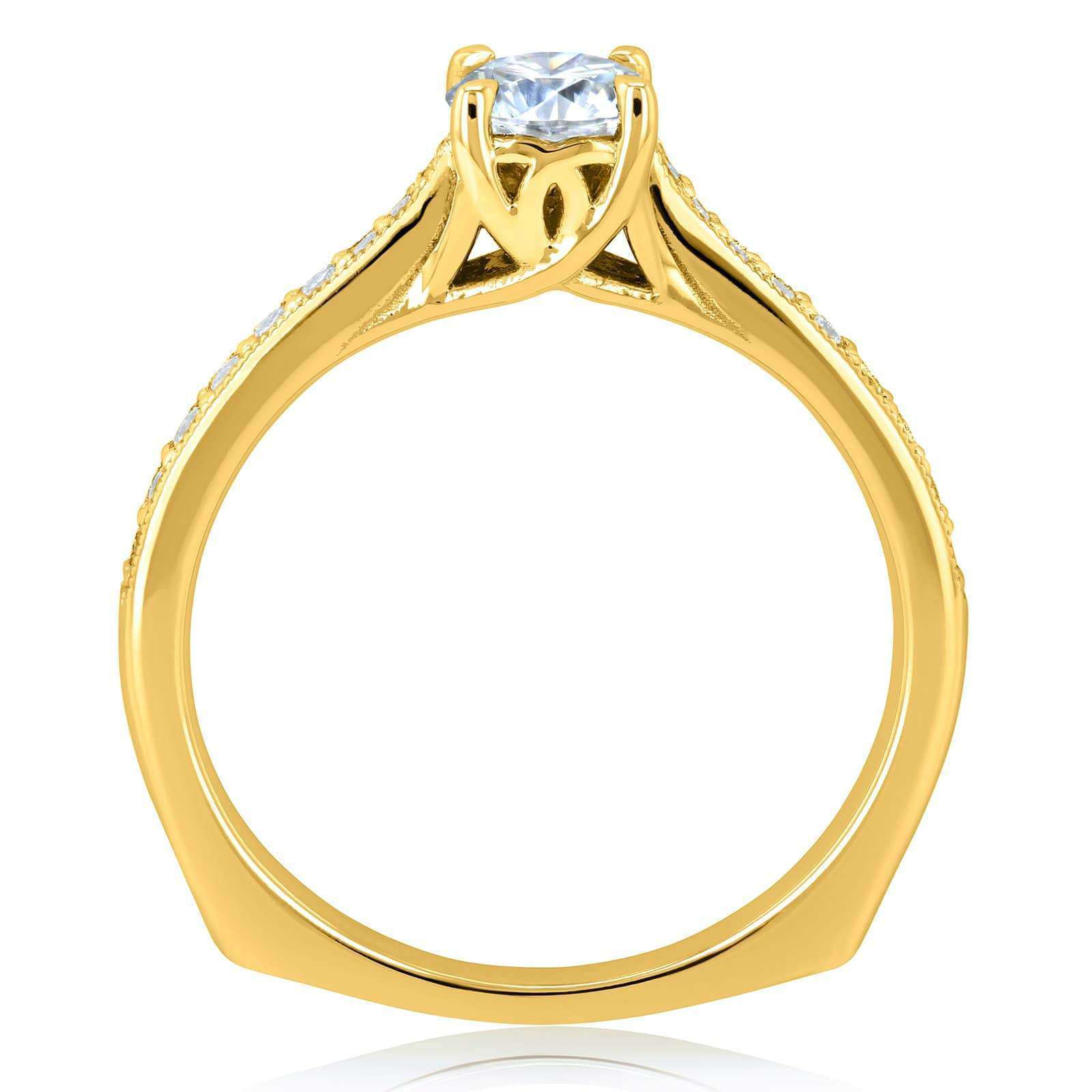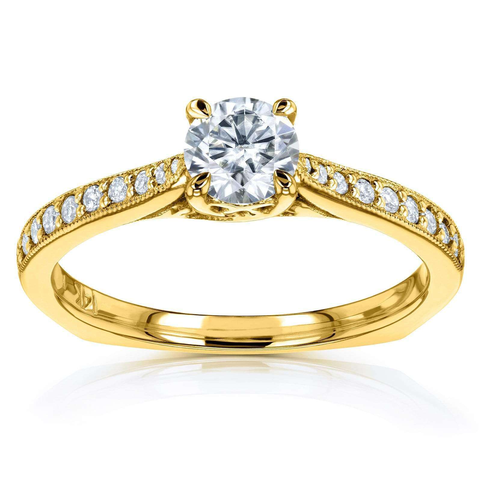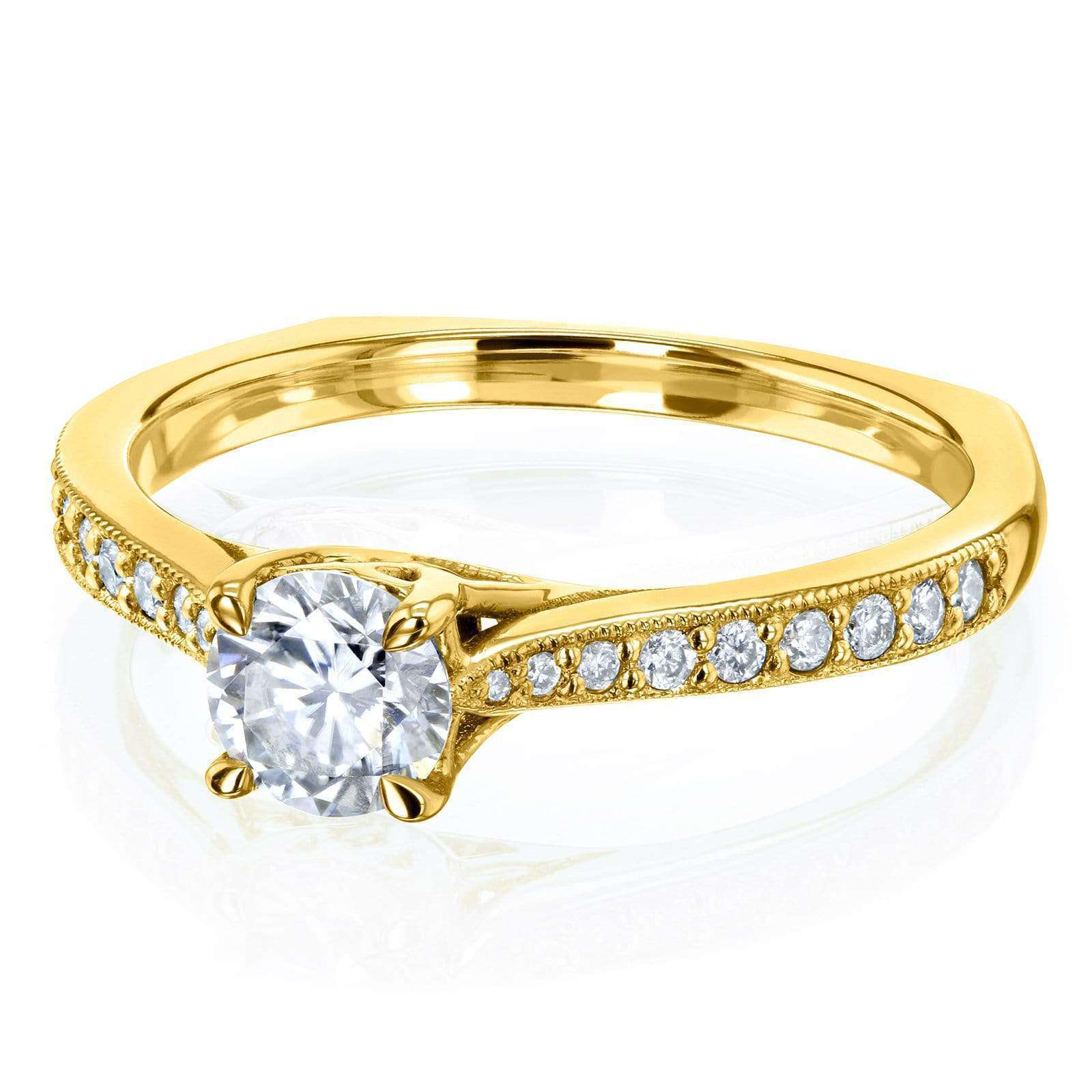 A round-cut 5mm moissanite is held with an x-prong trellis setting over fourteen-karat gold and pave-set side diamonds. The diamonds are all genuine stones harvested from the earth from conflict-free sources. The center moissanite gemstone is a lab-created perfected stone made to sparkle greater than a diamond with its famed fire power. The band is decorated with vintage style milgrain edges which immediately enhances the dazzling diamonds with a dynamic of patterned ruffles and a captivating appearance fit for royalty. The smart design of this engagement ring features a square shank known as a European shank to help keep the ring from spinning off center as you wear it.