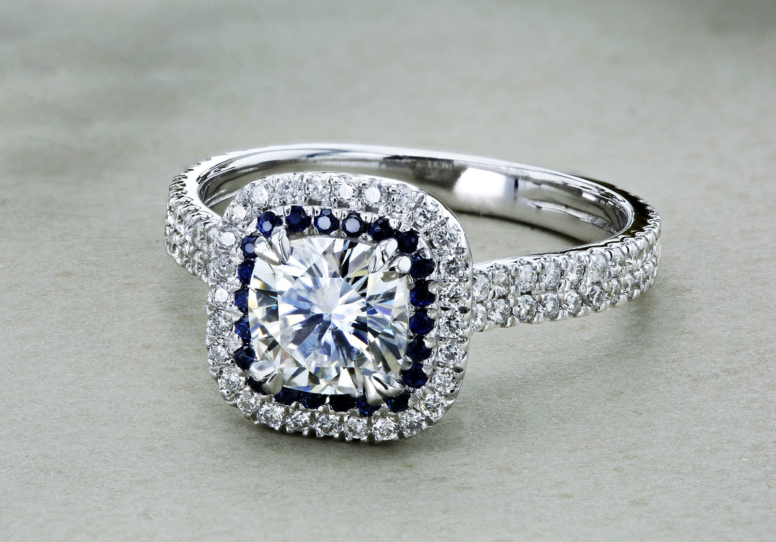 • One 6.5mm Cushion Moissanite (1.30ct)