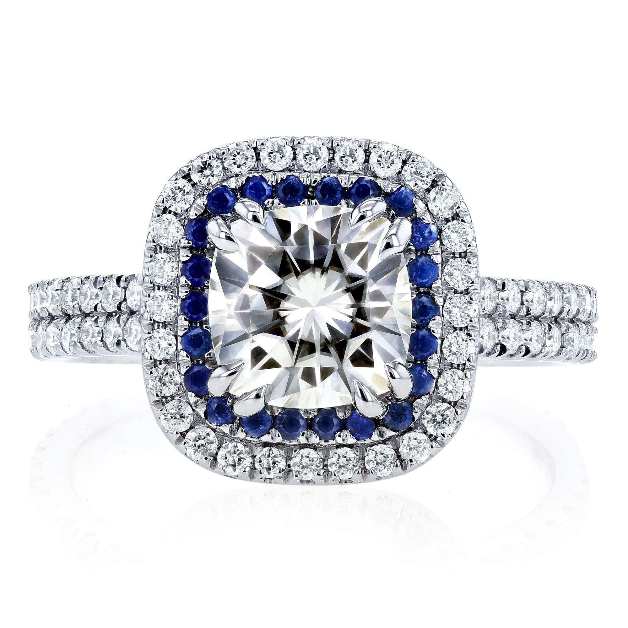 2 Carat TW Moissanite with Diamond and Sapphire Cushion Halo Engagement Ring in 14k White Gold