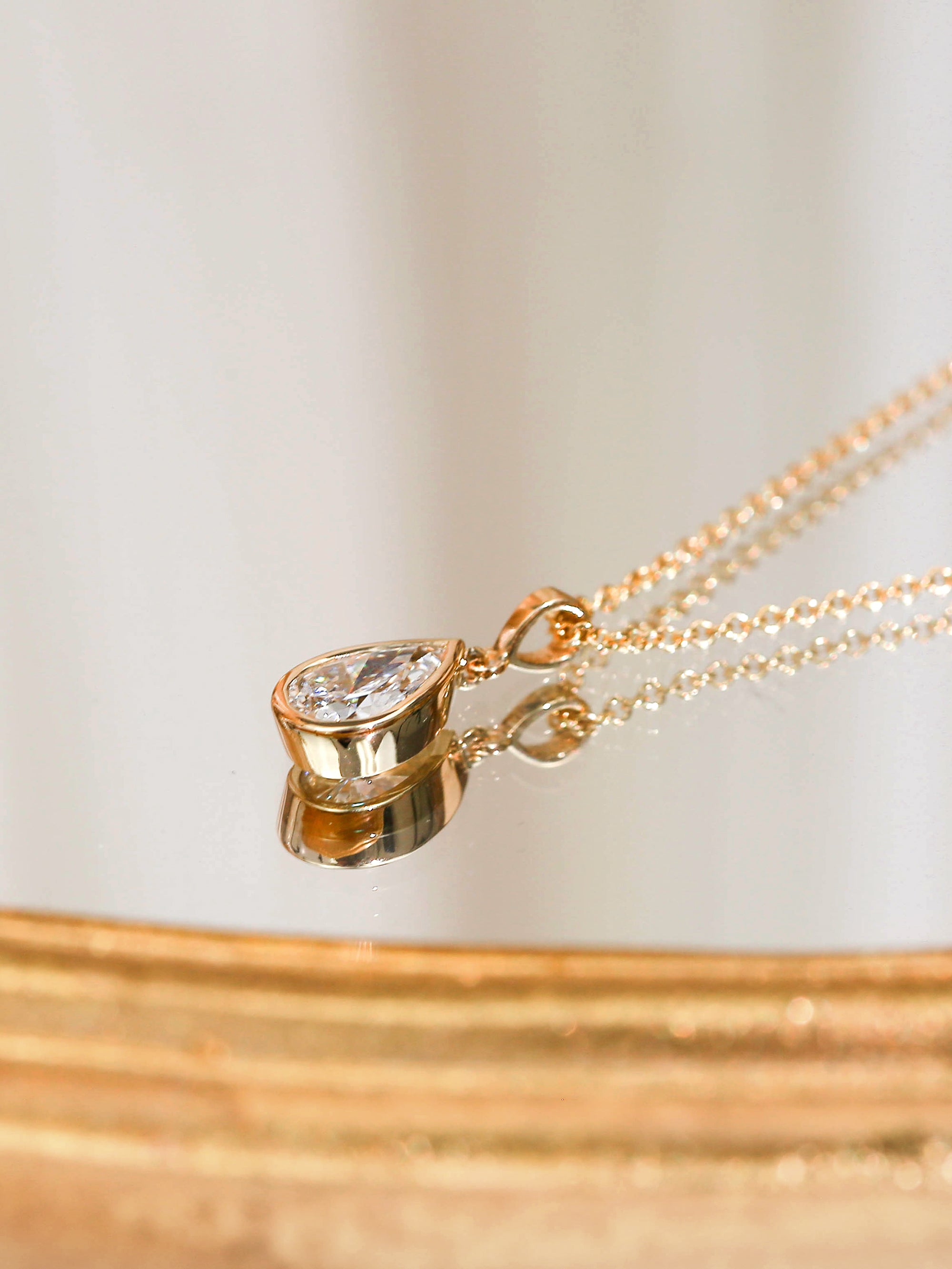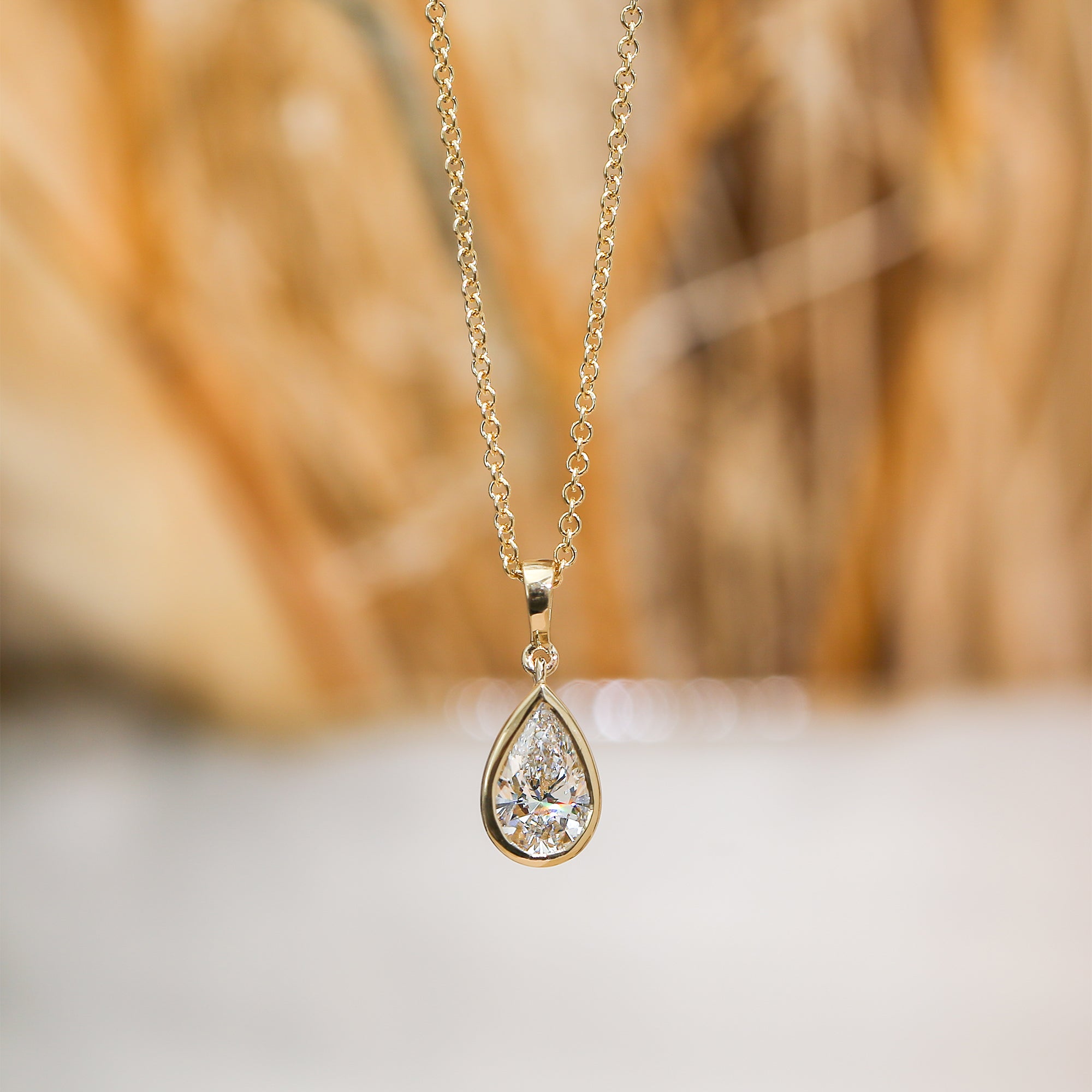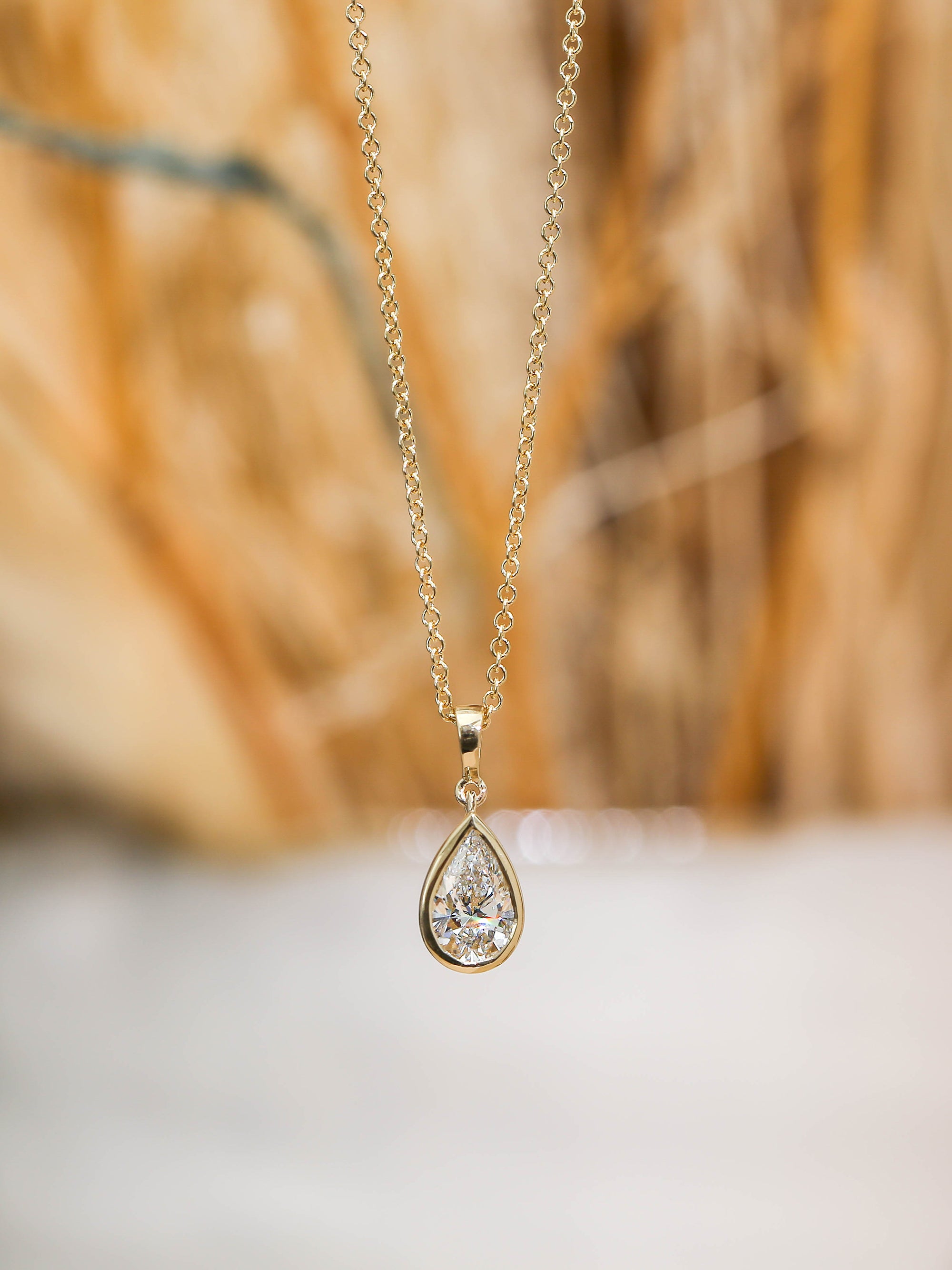 A single pear brilliant lab grown diamond is featured on this elegant necklace. The pendant comes strung to an 18 inch chain that can be secured with a clasp at 16, 17, or the full 18 inches.