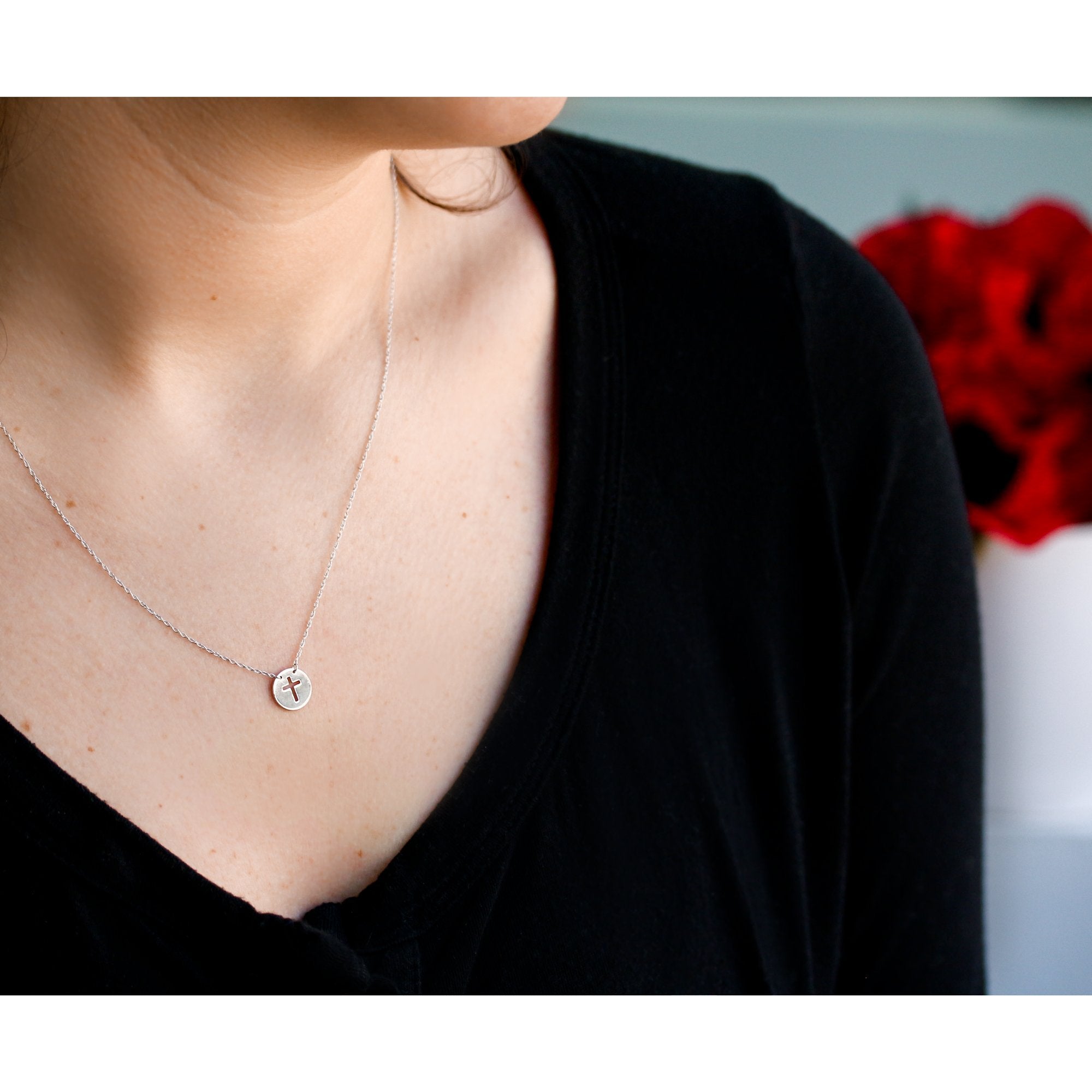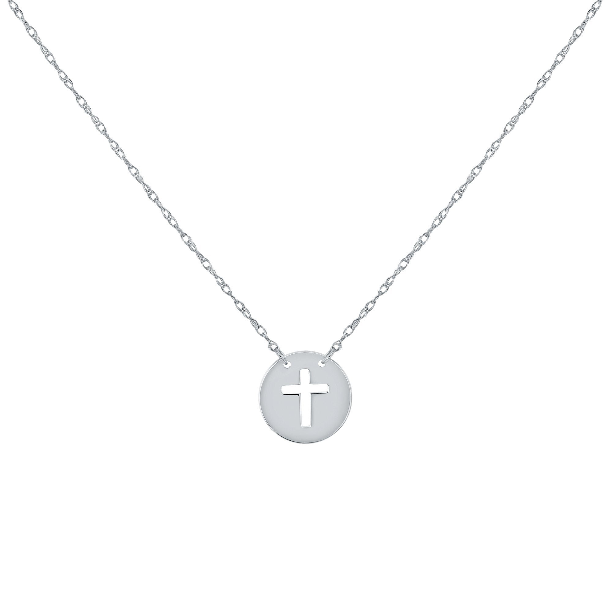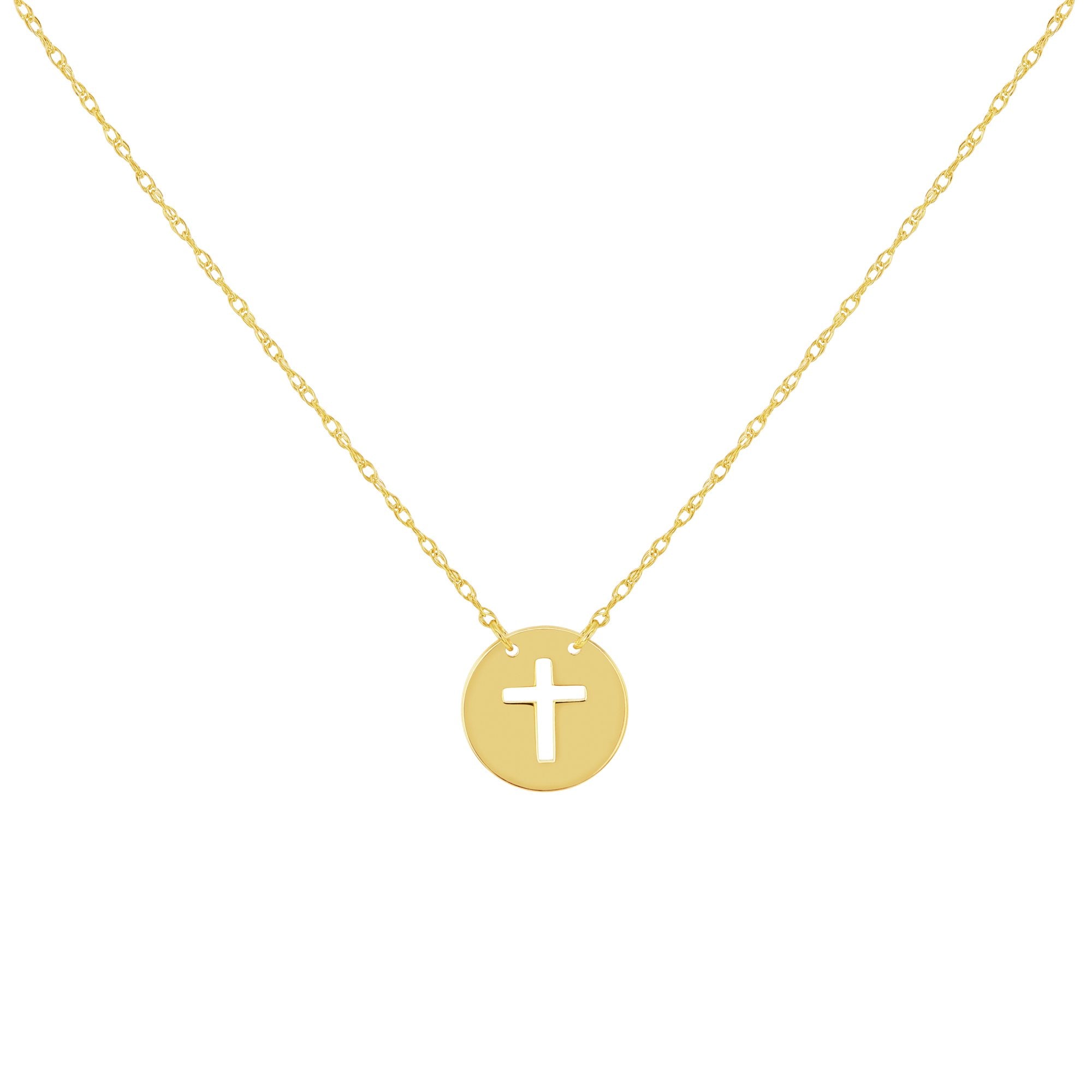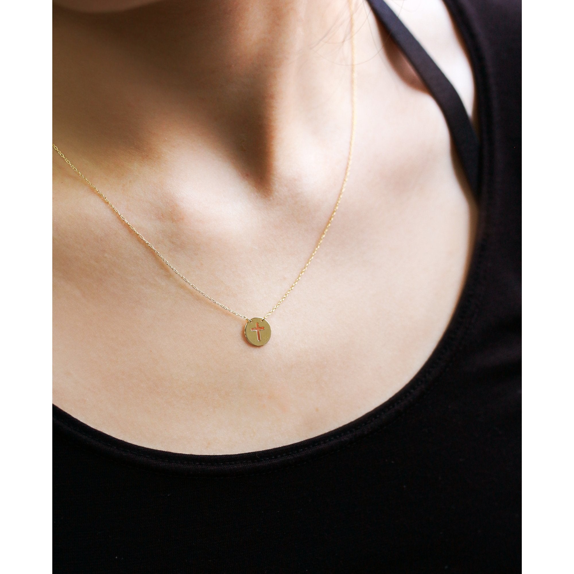 Carry your faith close to your heart with our petite stencil cross necklace. With a trick of light and shadow, you can even project the silhouette across a distance to admire. The necklace is made with solid 14-karat yellow gold. The tag pendant is about the size of your ring finger nail for a refined look that is not too big and not too small.