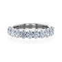 Our designer, Louise, sought to create a diamond band capturing ambient aesthetics with an orderly arrangement. She achieved this with a clean design where the metalwork flows in uniform continuity carrying near-identical oval white diamonds.