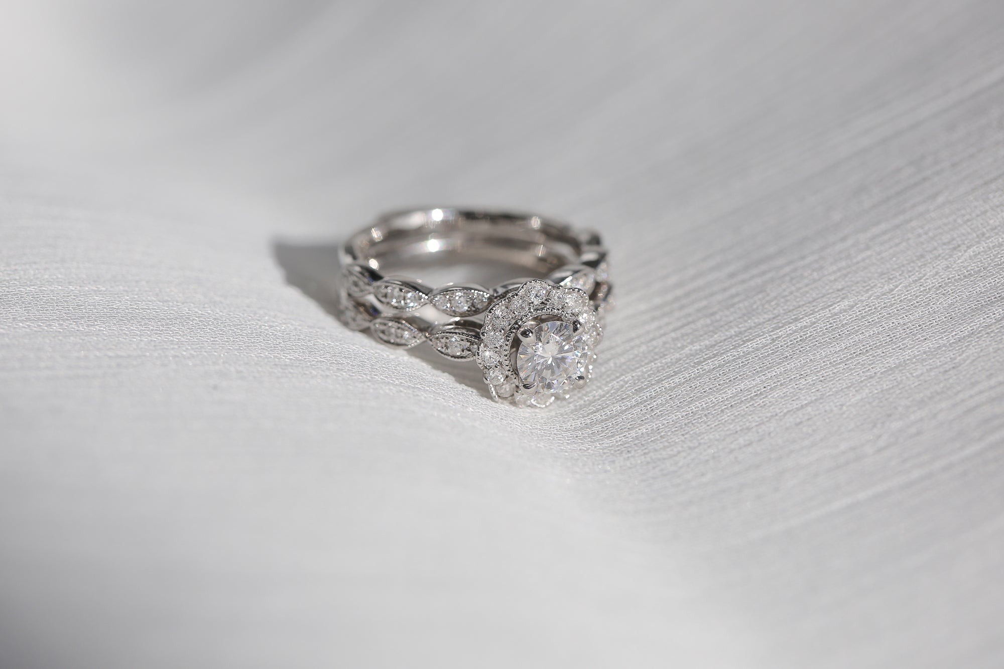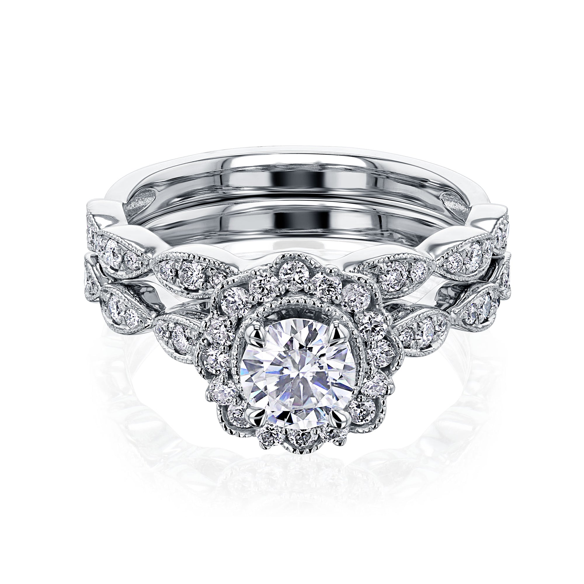 A 5 mm round moissanite is the focal point of this intricate vintage-inspired engagement ring in solid white gold metal. Featuring a halo of sparkling white round diamonds emphasized with handcrafted milgrain etchings, it's a gorgeous piece that's sure to warrant compliments. Perfectly matching with the ring is our dainty band which features 19 round white natural diamonds in a scalloped design and milgrain details. This charming band's design also makes it perfect for stacking with other rings whether solid gold or adorned with diamonds.