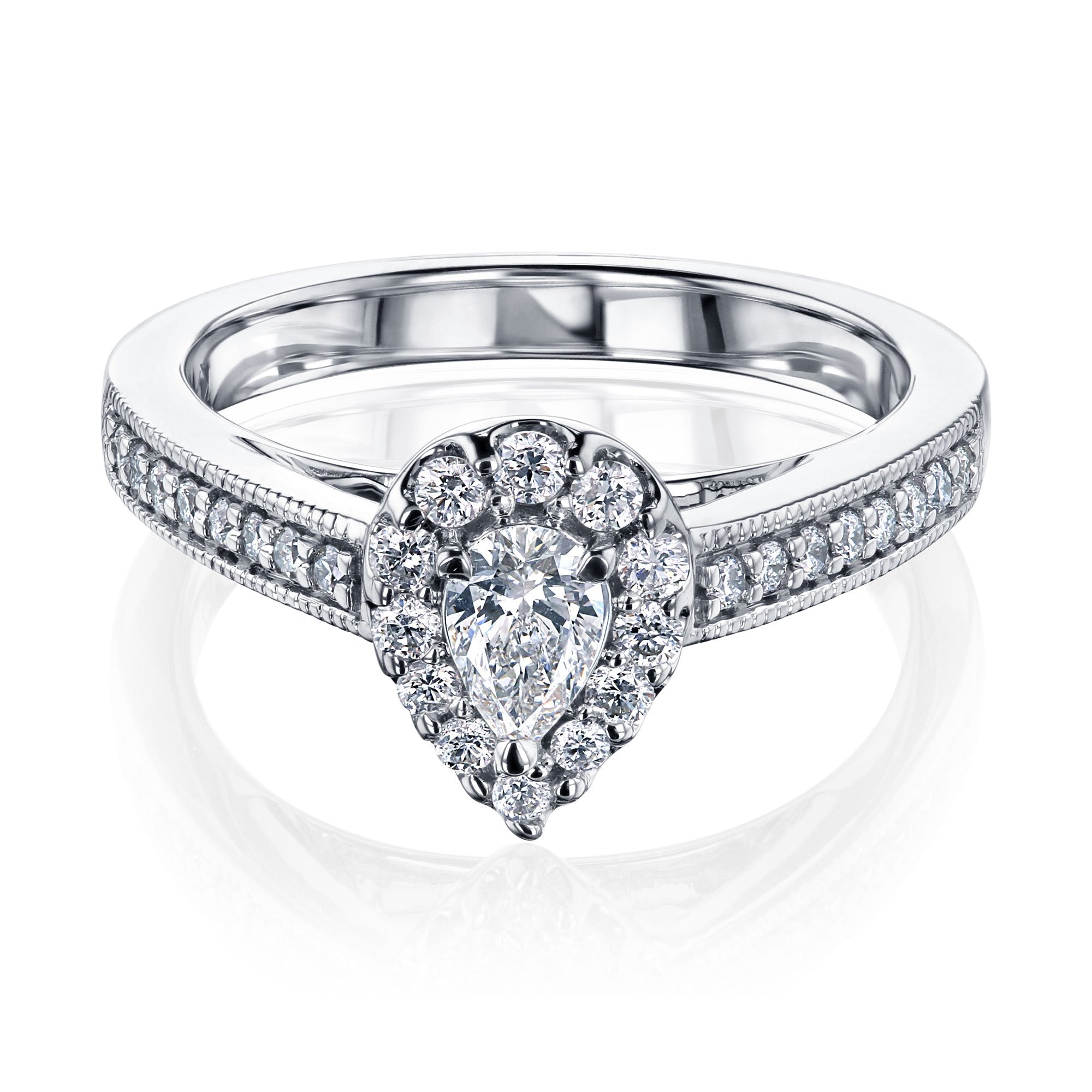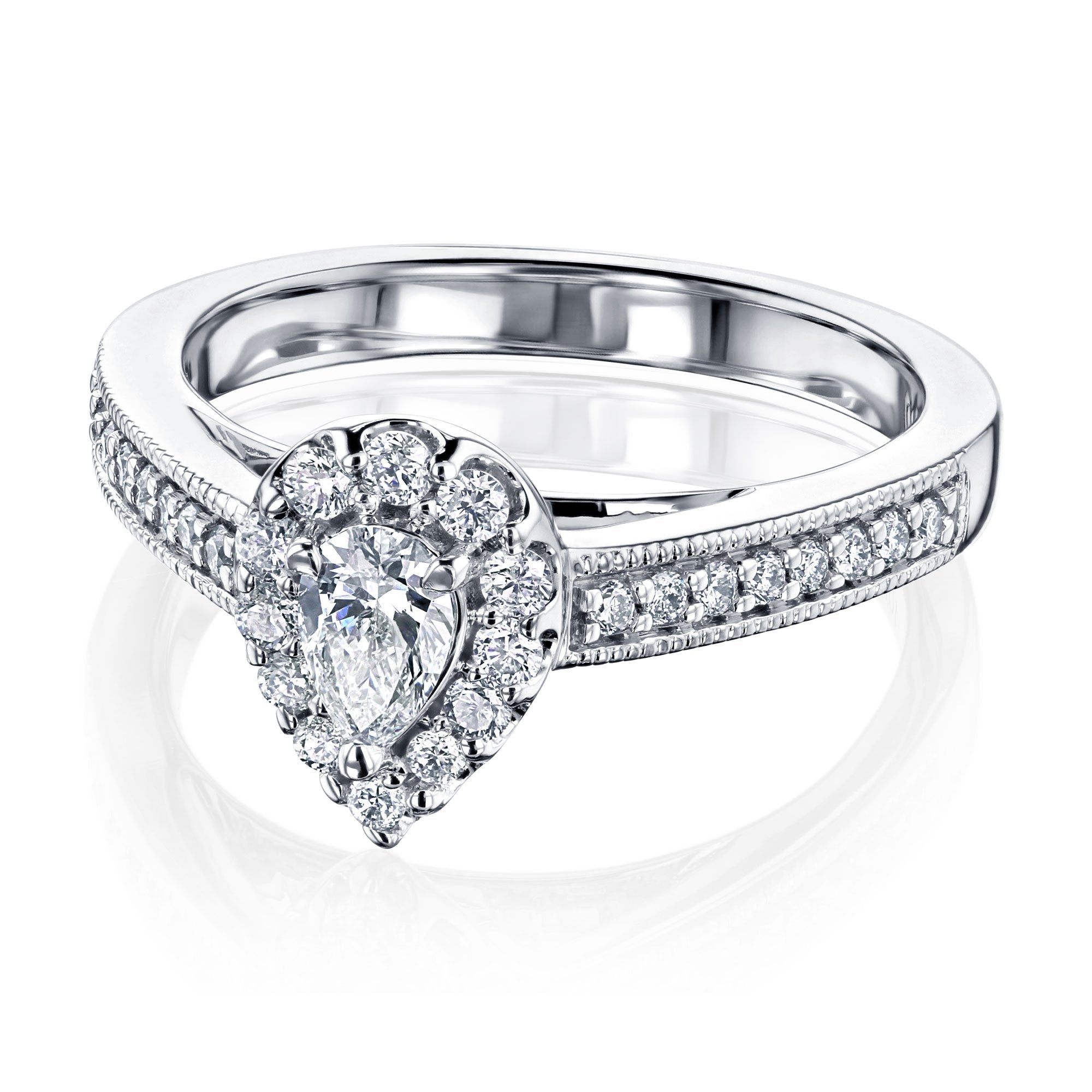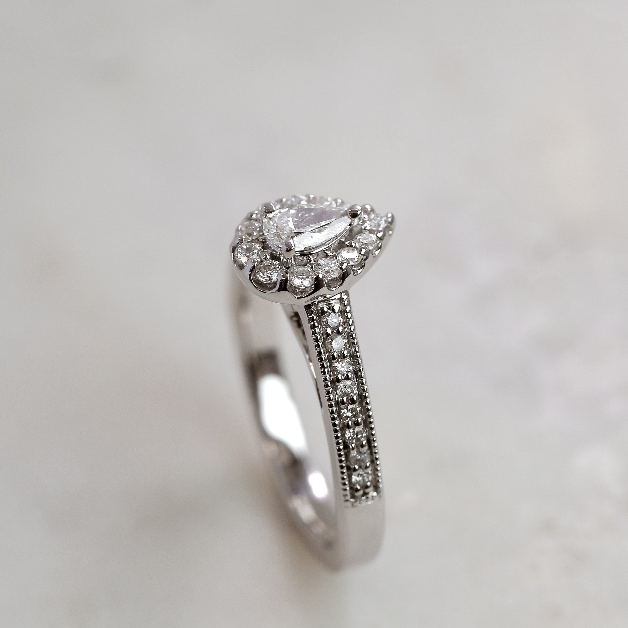 The unique look of a pear-cut diamond is highlighted in this ring with the shimmering halo of round diamonds contoured to its shape. This fine jewelry piece also features a peek-a-boo design underneath the center for a sweet sparkling surprise on each side of the ring. The handmade milgrain along the shank keeps that vintage-style vibe you know and love.