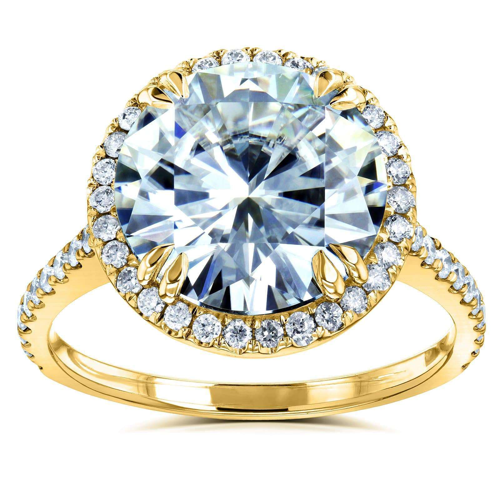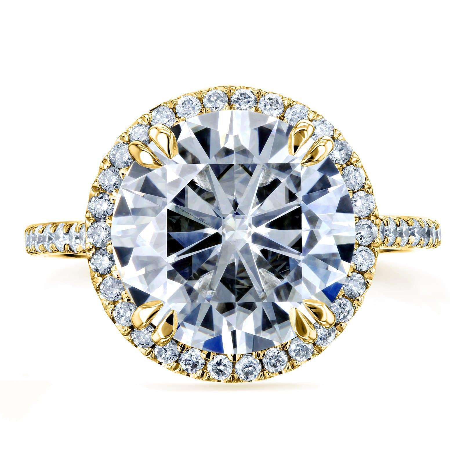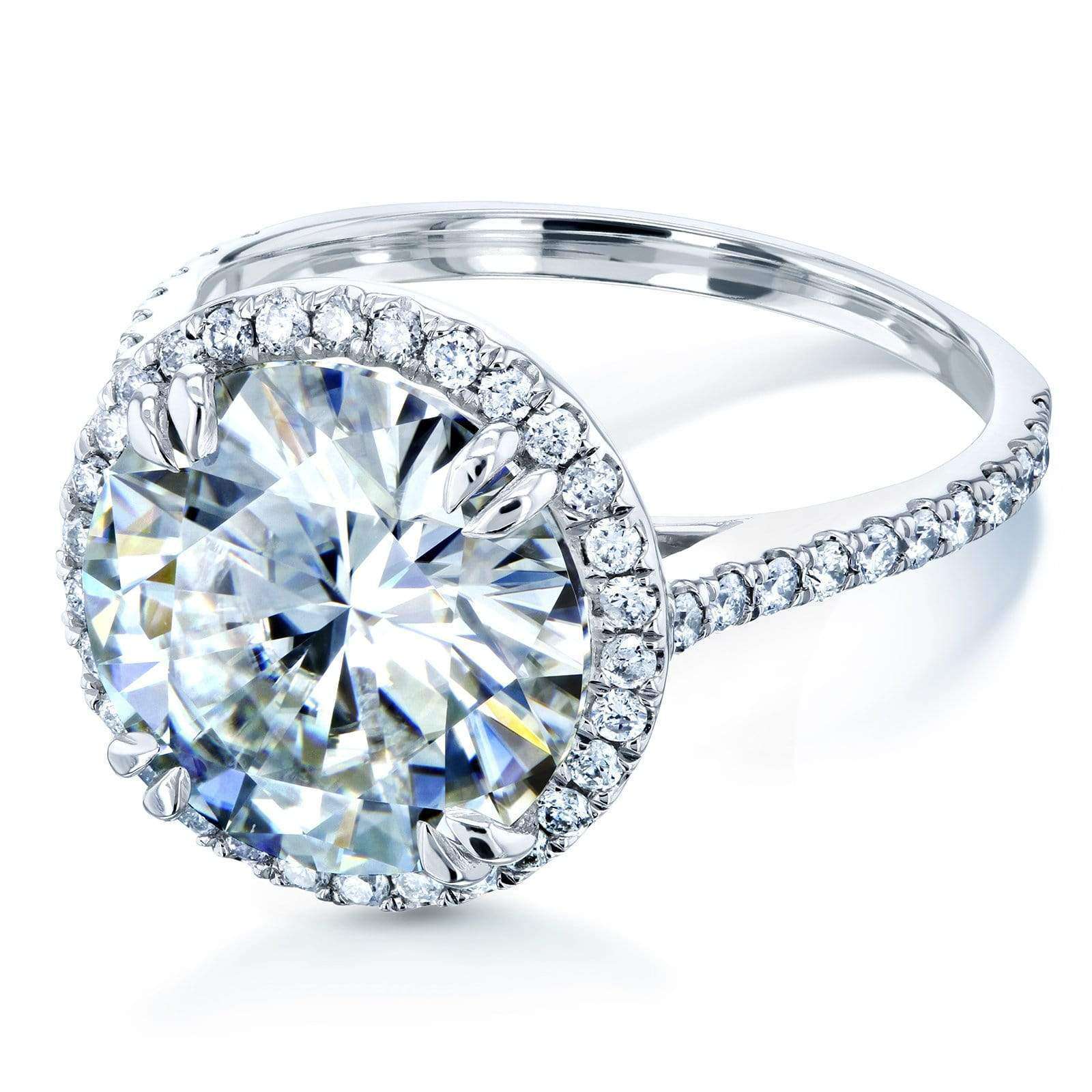 It's time to fall in love all over again. This magnificent diamond halo and moissanite center ring will capture your heart the moment you pop the box. The 11 millimeter center stone is a reputable lab-created gemstone known as moissanite while the natural-grown side stones are all GH diamonds. The round-cut moissanite weighs 4.75 carats DEW. The round-cut diamonds collectively weigh 2/5 carats TDW and are graded at G to H color with I1 to I2 clarity.