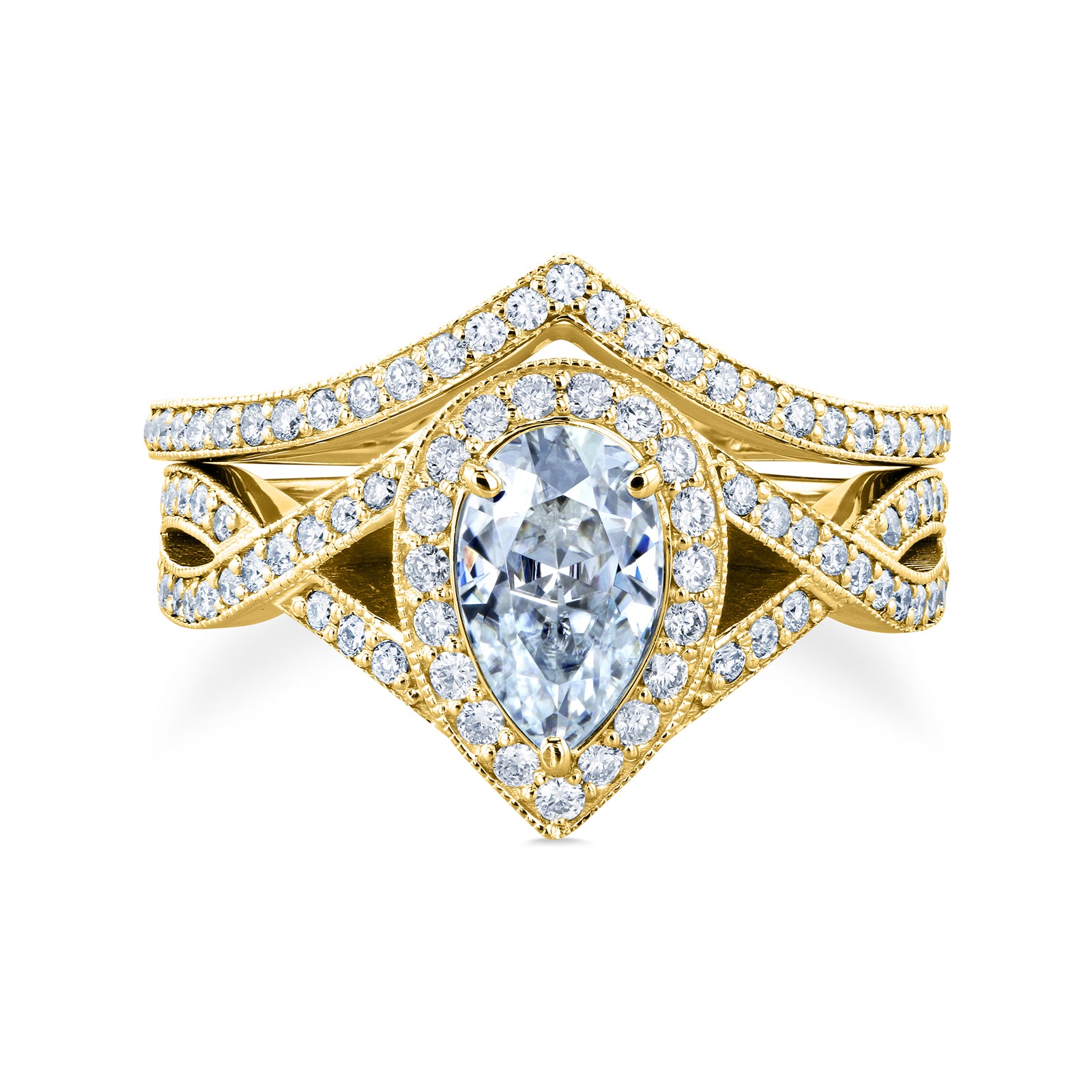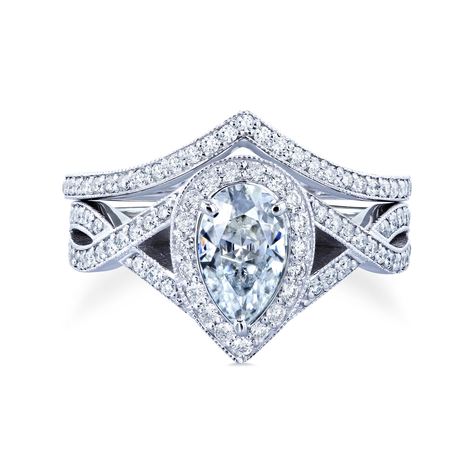 A sparkly pear shaped center is set within a diamond halo on this cross-over twist style diamond band. Matching to this engagement ring is a chevron wishbone diamond wedding band. The rings collectively carry over 100 diamonds running halfway down the bands. They are finished with a bright polish in 14-karat gold bringing a luscious shine to best compliment the shining stones.